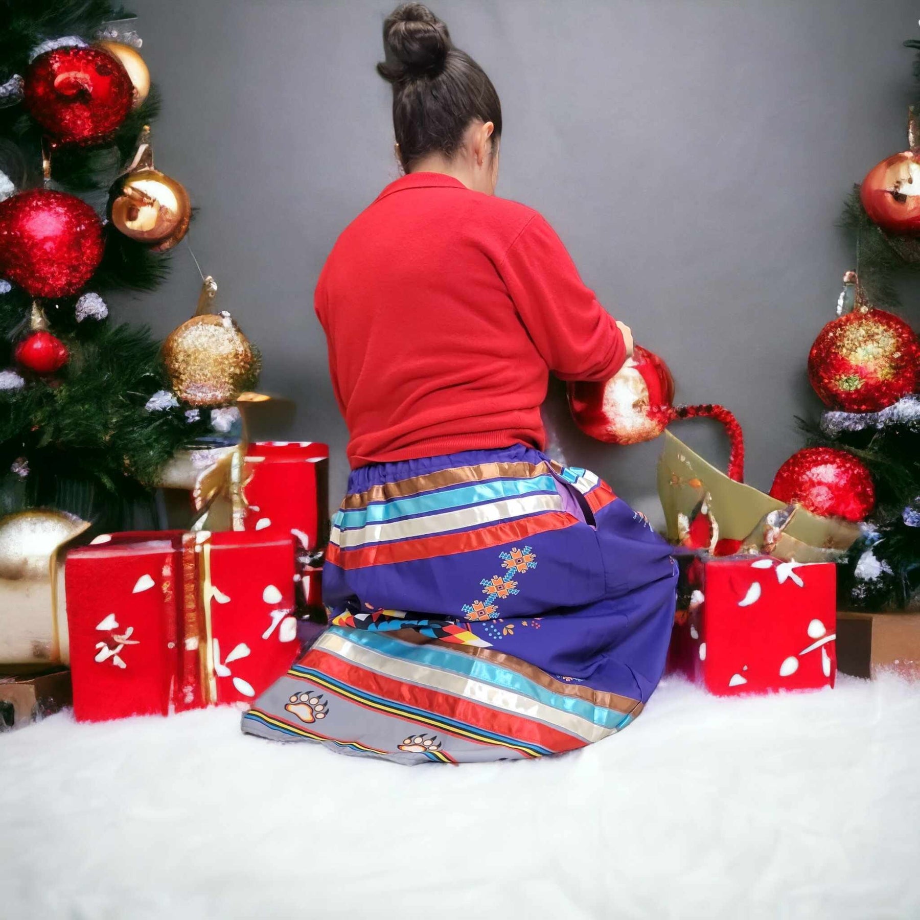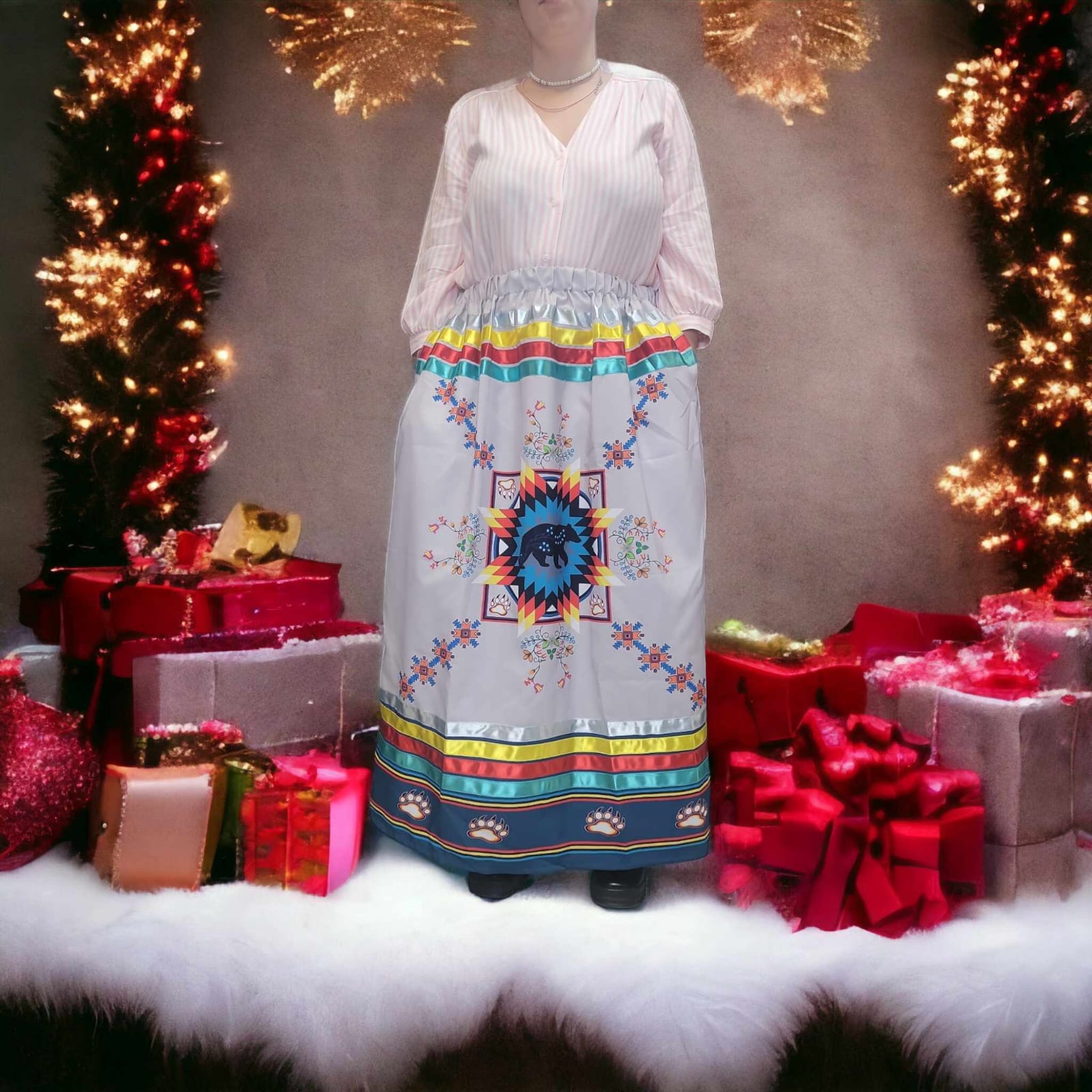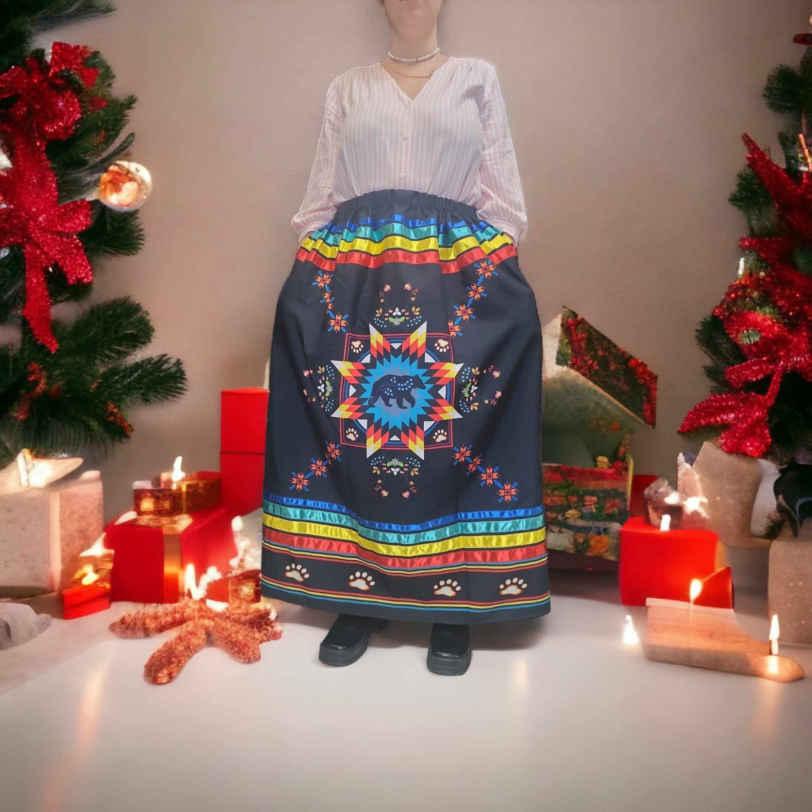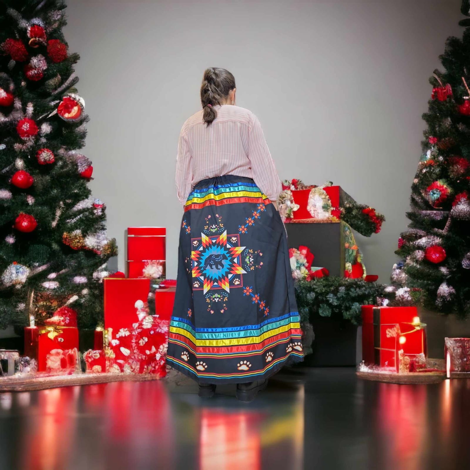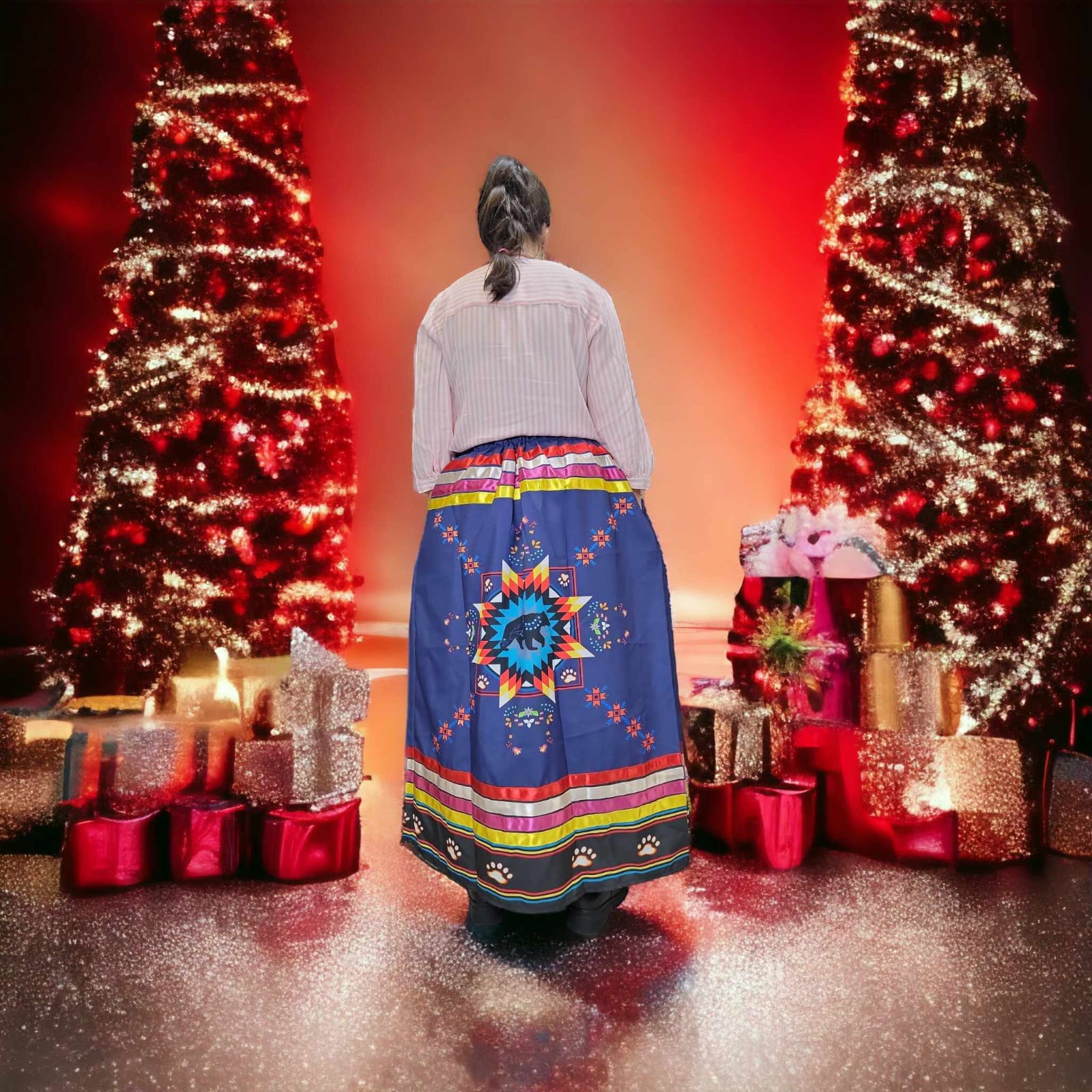 Our skirts feature vivid imagery — children walking toward a tipi, surrounded by nature — symbolizing unity, healing, and connection.