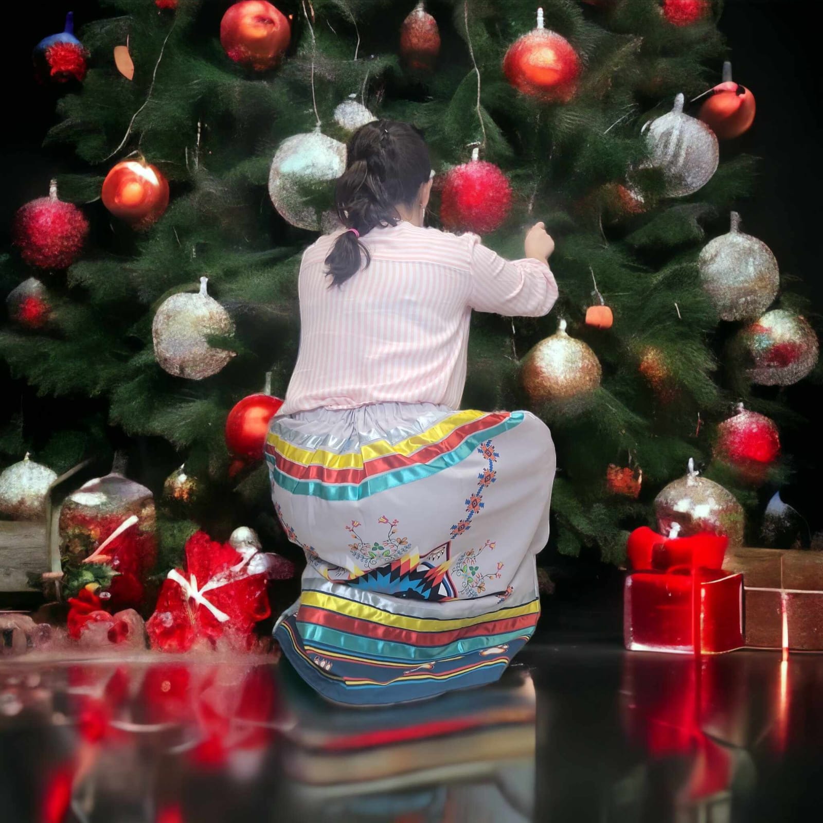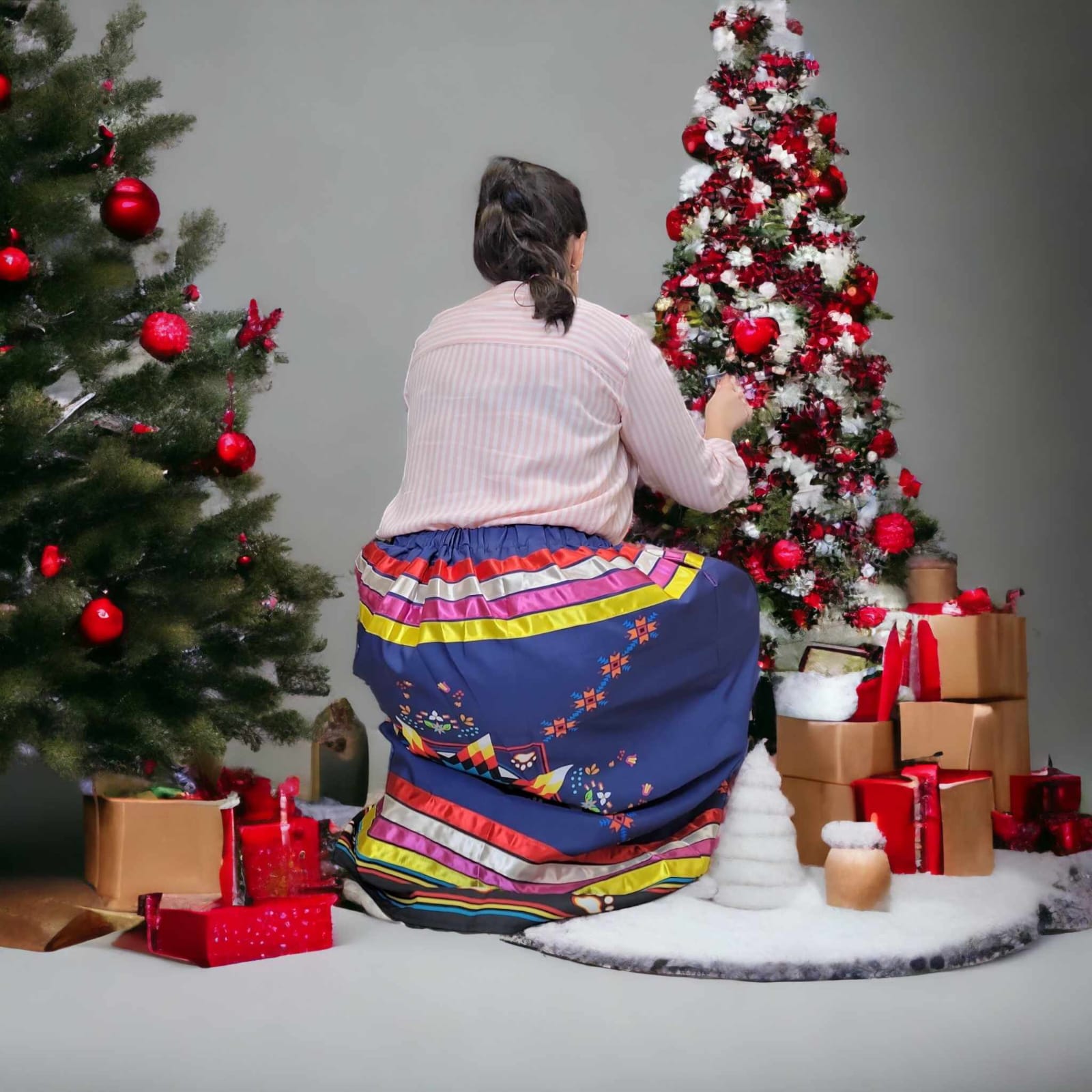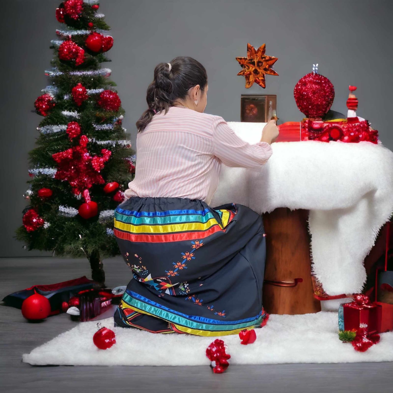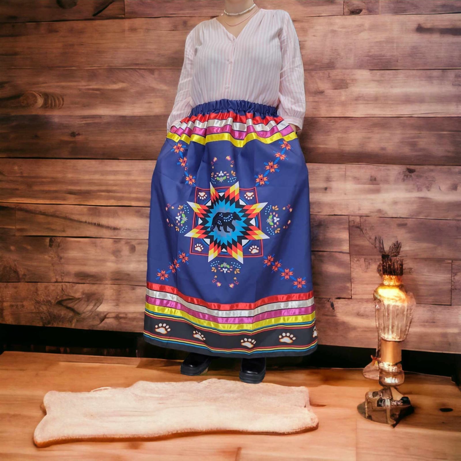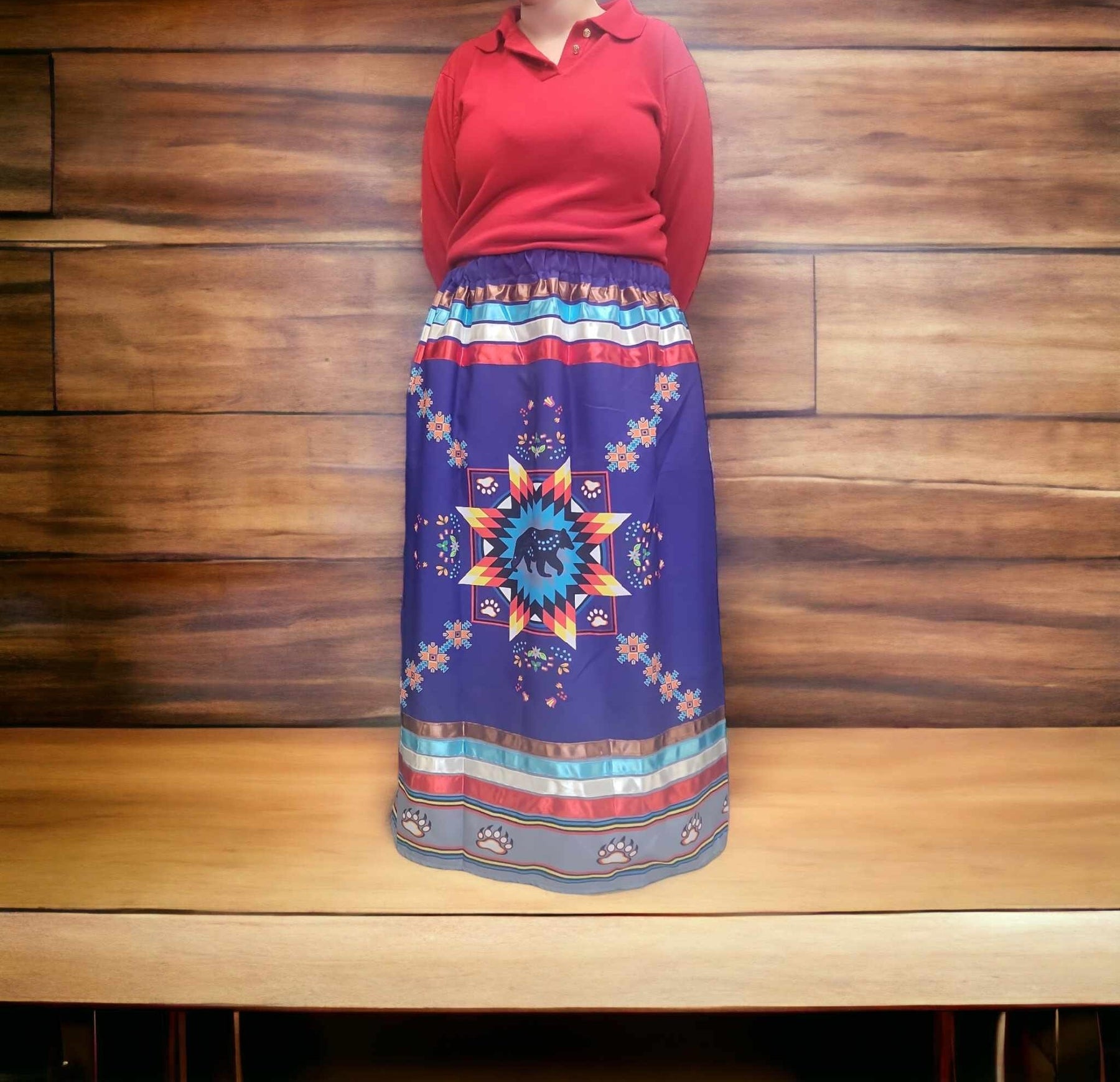 Our skirts feature vivid imagery — children walking toward a tipi, surrounded by nature — symbolizing unity, healing, and connection.