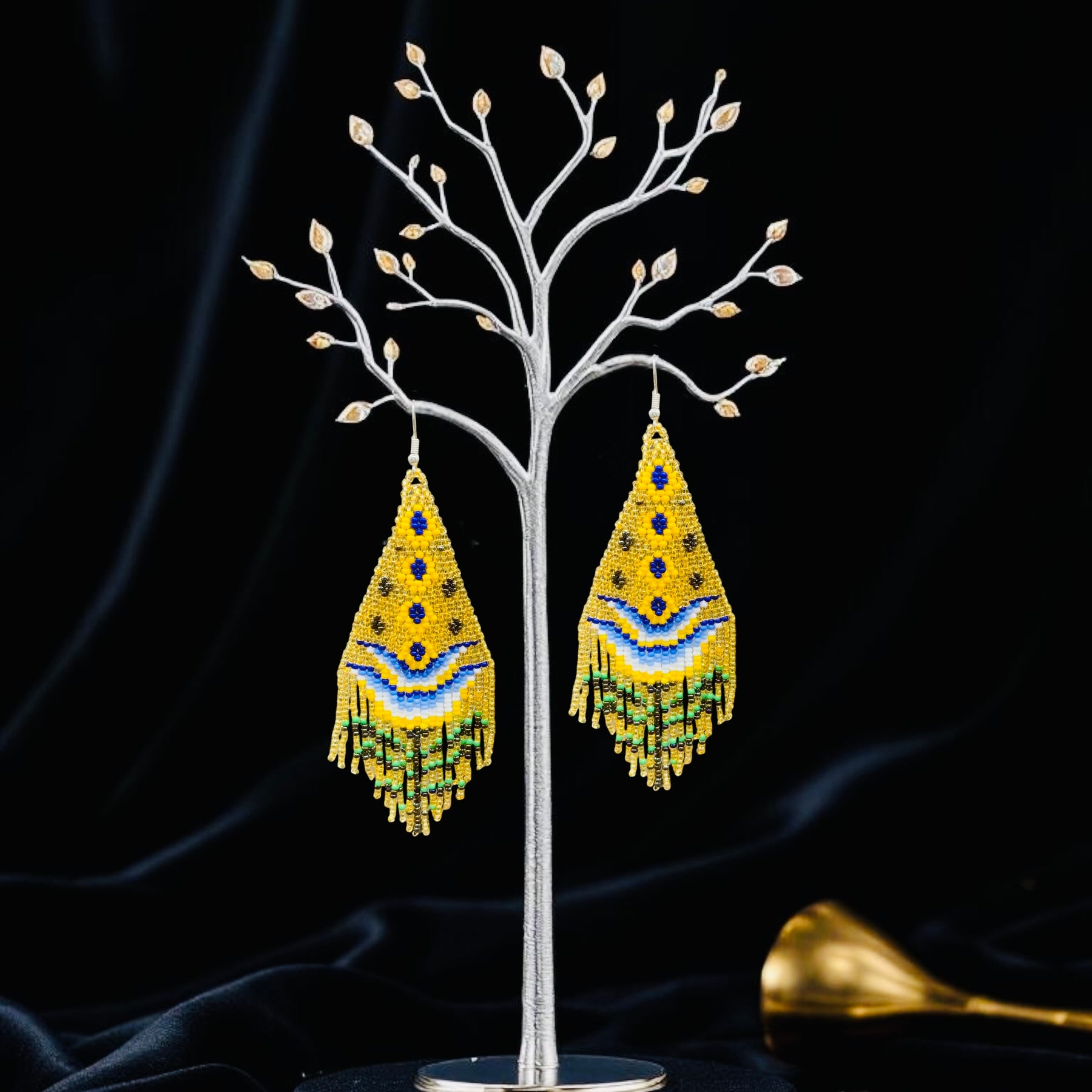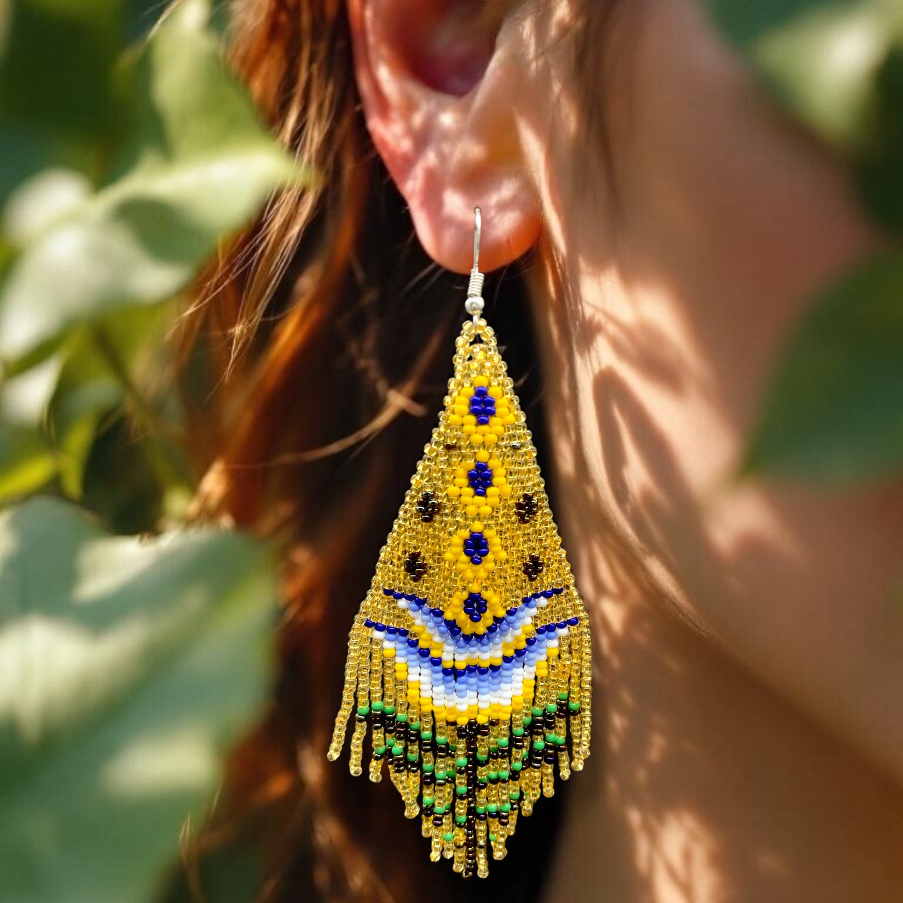 These earrings capture the essence of nature’s fire and flower — bold, radiant, and full of life. The intricate pattern symbolizes blossoming strength and vibrant spirit, while the carefully hand-woven fringe adds soft rhythm and fluidity. Perfect for powwows, festivals, or to elevate your everyday style.