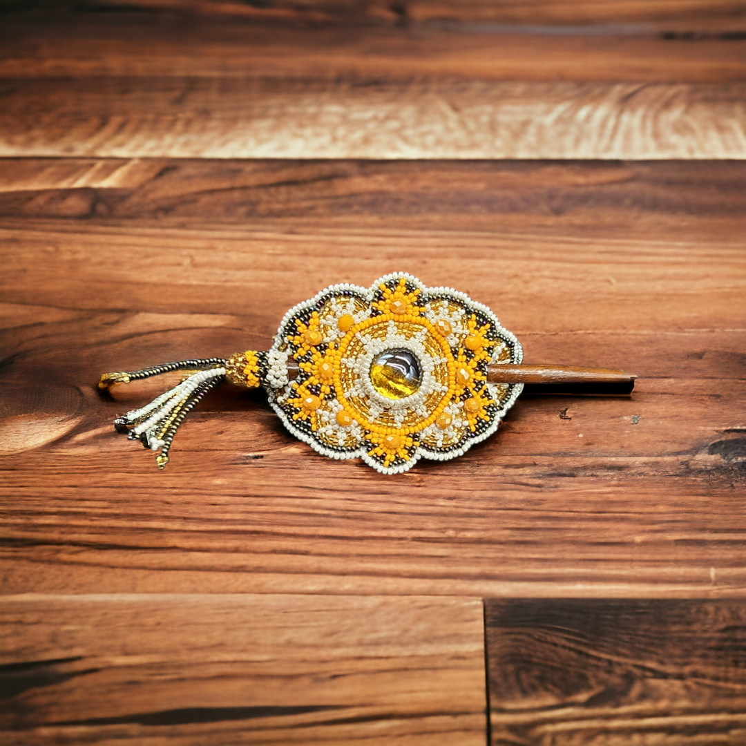 Native American Style Barrette measuring 12 cm wide 11/0 Seed Beaded Barrette., Natural Sheesham Wood Hair Stick..