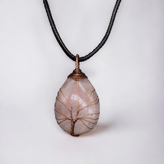 Light pink Gemstone Pendant Wrapped w/ Bronze Tree of Life