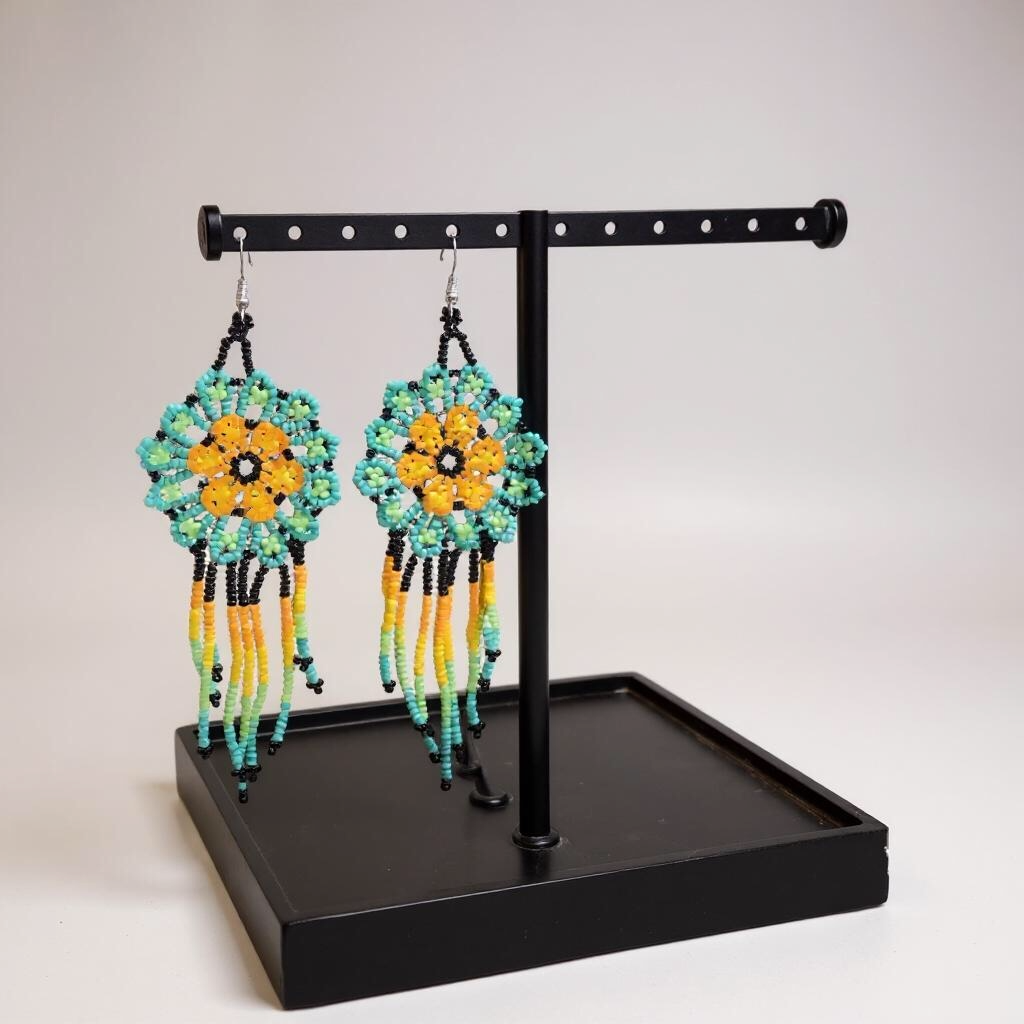 These earrings evoke the warmth and energy of a rising sun. The layered beaded petals form a radiant bloom that cascades into a striking fringe. Whether you’re dressing up a casual look or adding flair to your regalia, these earrings bring color, movement, and cultural pride to any outfit.