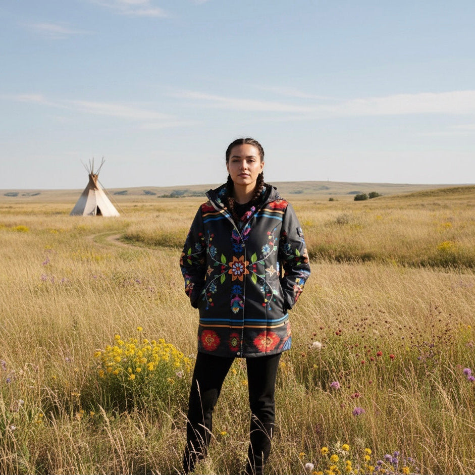 Our jackets come from Indigenous countries—Peru, Guatemala, Mexico, and Ecuador—and are 100% handmade. Our blankets are manufactured in Canada, and our beadwork is made by local artisans in Alberta.