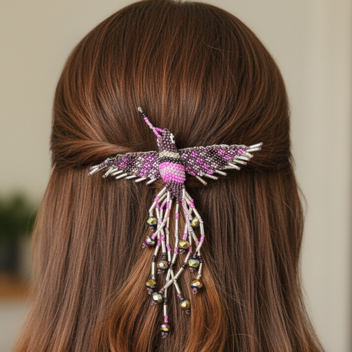 This stunning barrette showcases the artistry of Indigenous-inspired beadwork, featuring a radiant hummingbird design that symbolizes joy, energy, and renewal.