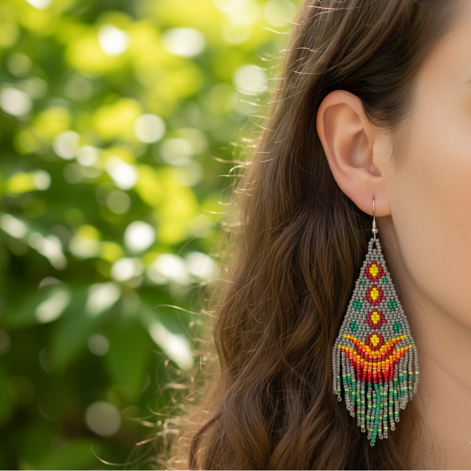 These earrings capture the essence of nature’s fire and flower — bold, radiant, and full of life. The intricate pattern symbolizes blossoming strength and vibrant spirit, while the carefully hand-woven fringe adds soft rhythm and fluidity. Perfect for powwows, festivals, or to elevate your everyday style.