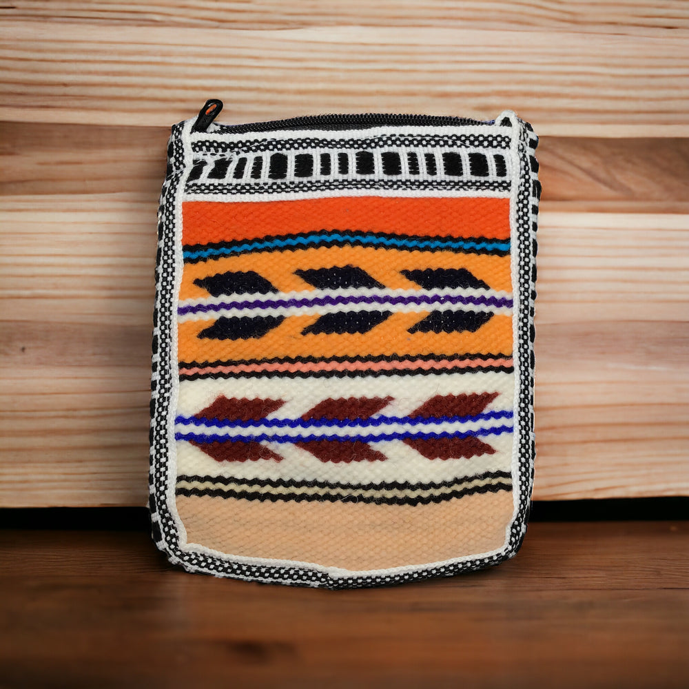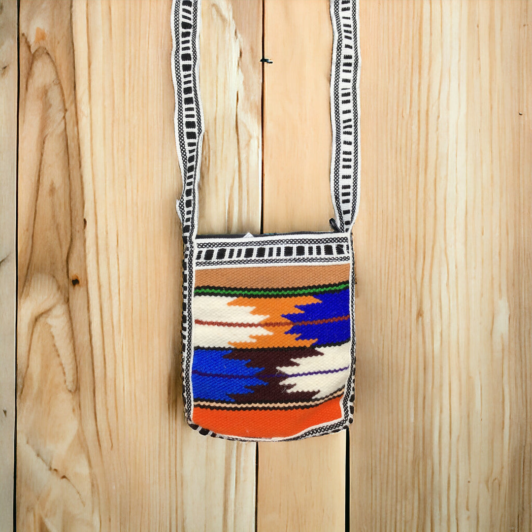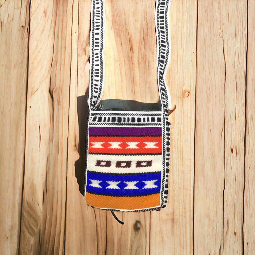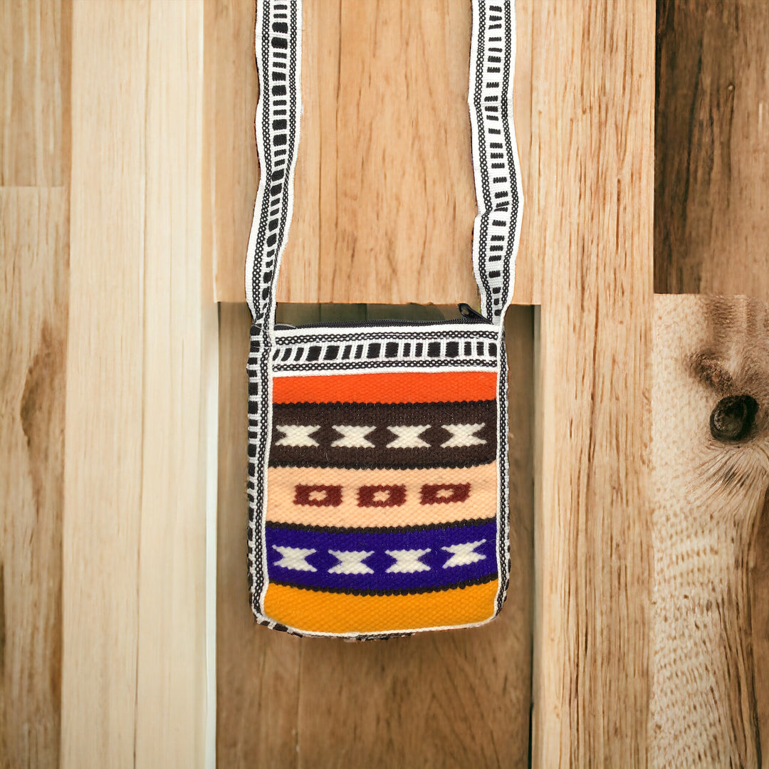 Introducing our exquisite handmade crossbody bag, featuring a vibrant tribal pattern that adds a pop of color to any outfit. This stylish accessory measures 4.5 by 5.5 inches, making it the perfect size to carry your essentials while on the go.