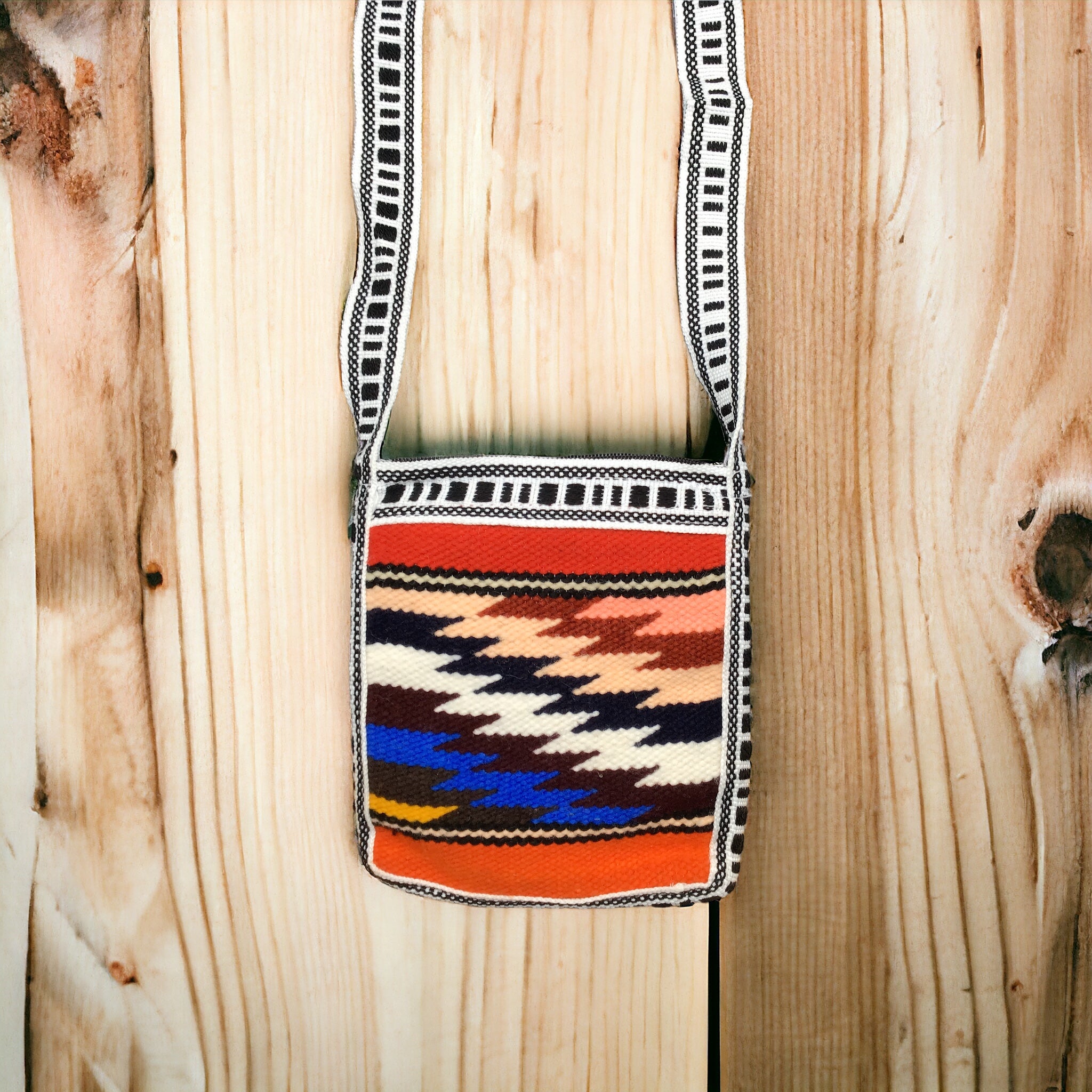 Introducing our exquisite handmade crossbody bag, featuring a vibrant tribal pattern that adds a pop of color to any outfit. This stylish accessory measures 4.5 by 5.5 inches, making it the perfect size to carry your essentials while on the go.
