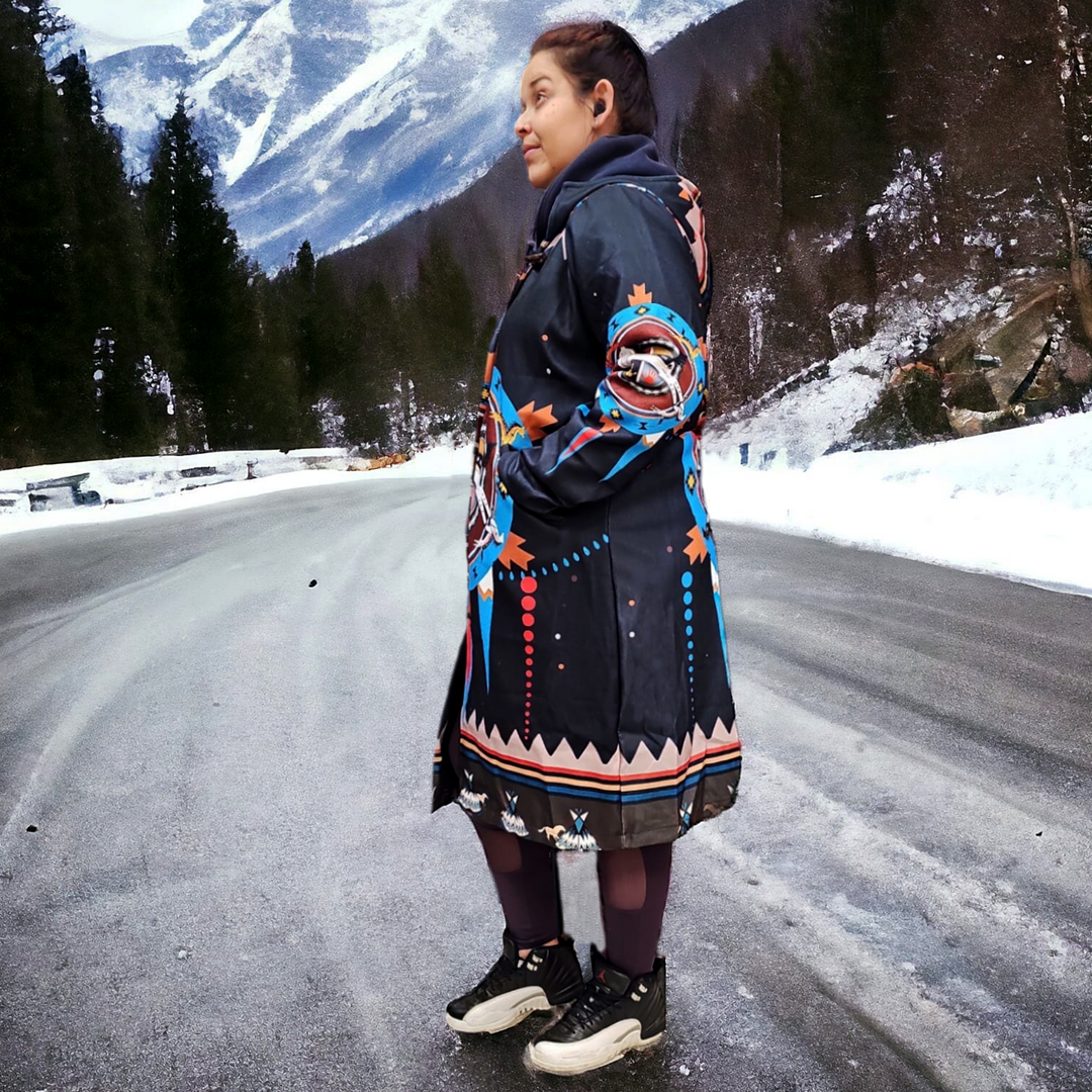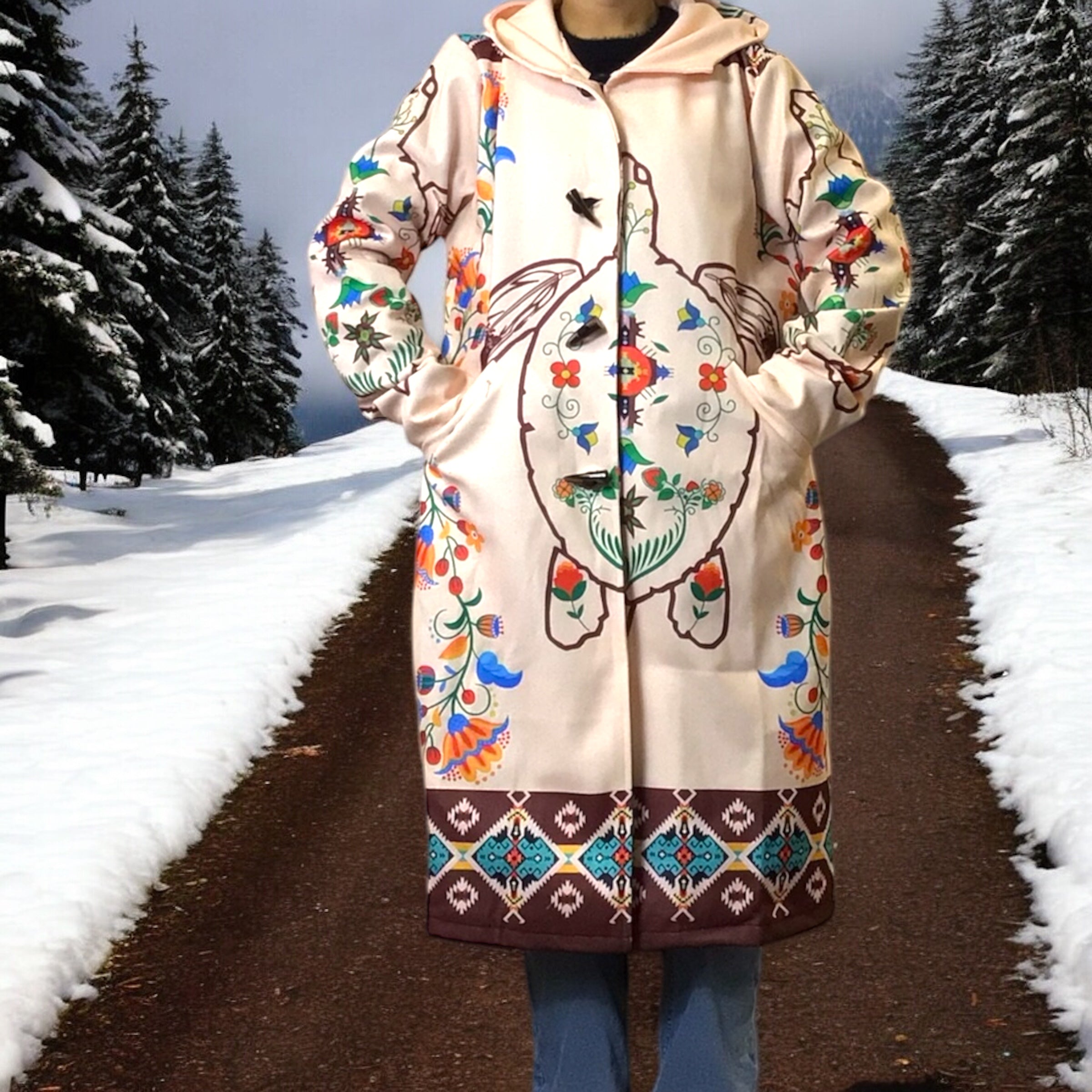 Our jackets come from Indigenous countries—Peru, Guatemala, Mexico, and Ecuador—and are 100% handmade. Our blankets are manufactured in Canada, and our beadwork is made by local artisans in Alberta.