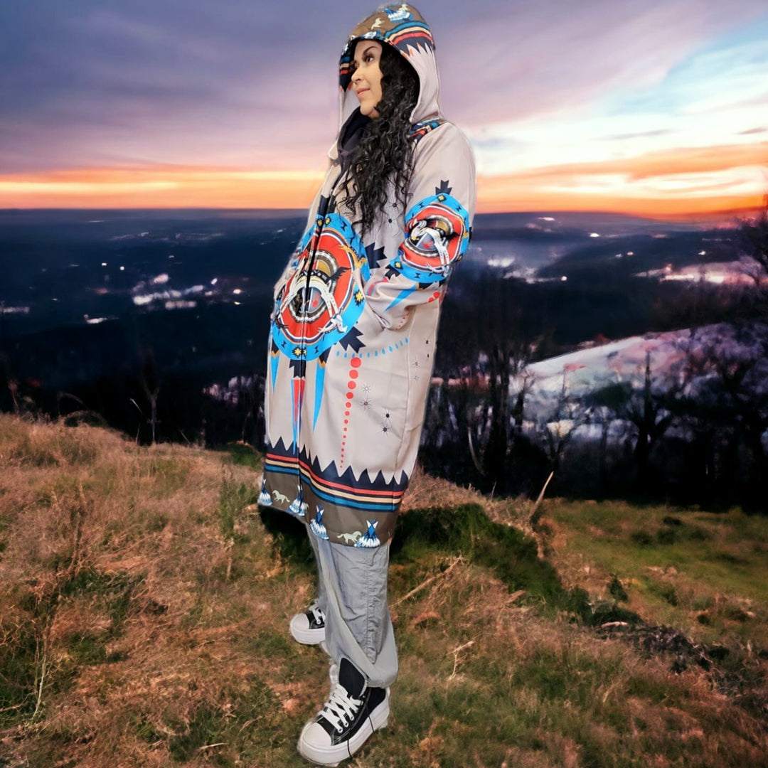 Our jackets come from Indigenous countries—Peru, Guatemala, Mexico, and Ecuador—and are 100% handmade. Our blankets are manufactured in Canada, and our beadwork is made by local artisans in Alberta.