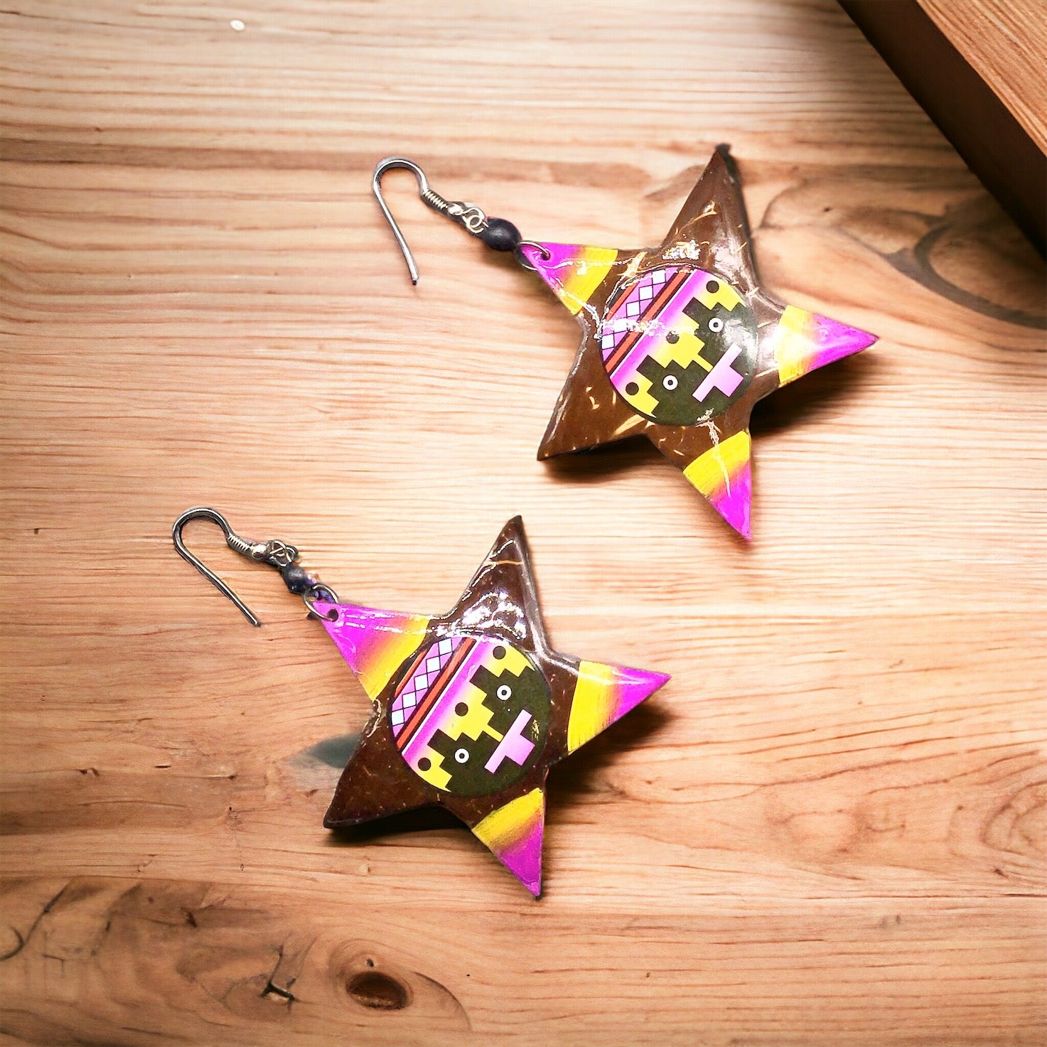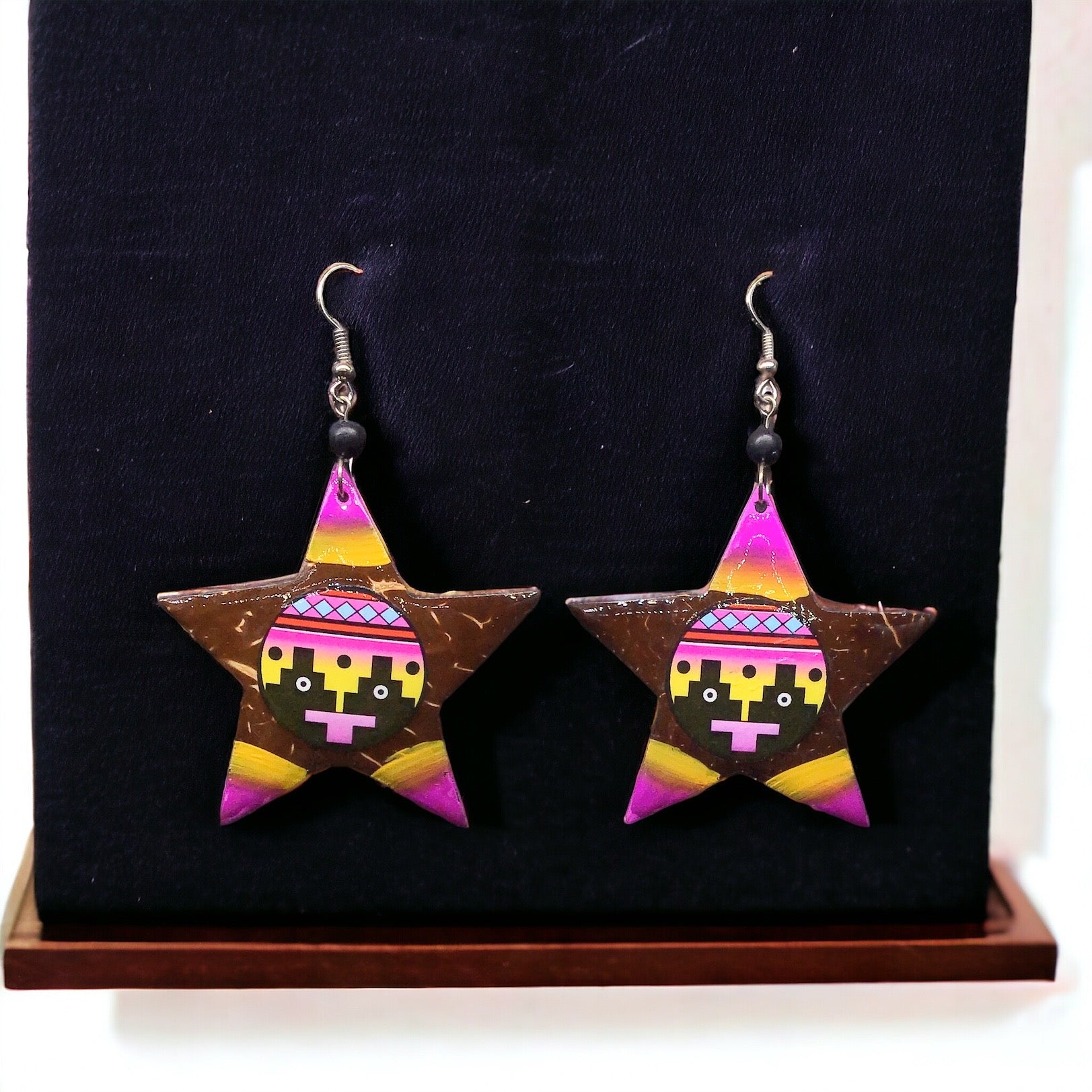 The unique combination of natural wood and colorful paint creates a striking contrast that is sure to catch the eye and spark conversation. Whether you're looking to add a pop of color to a simple jeans and t-shirt ensemble or elevate a little black dress, these Wood Painted Star Earrings are versatile enough to complement any look. With their intricate detailing and artisanal craftsmanship, these earrings are not just an accessory, but a work of art that will make you feel special every time you wear them.