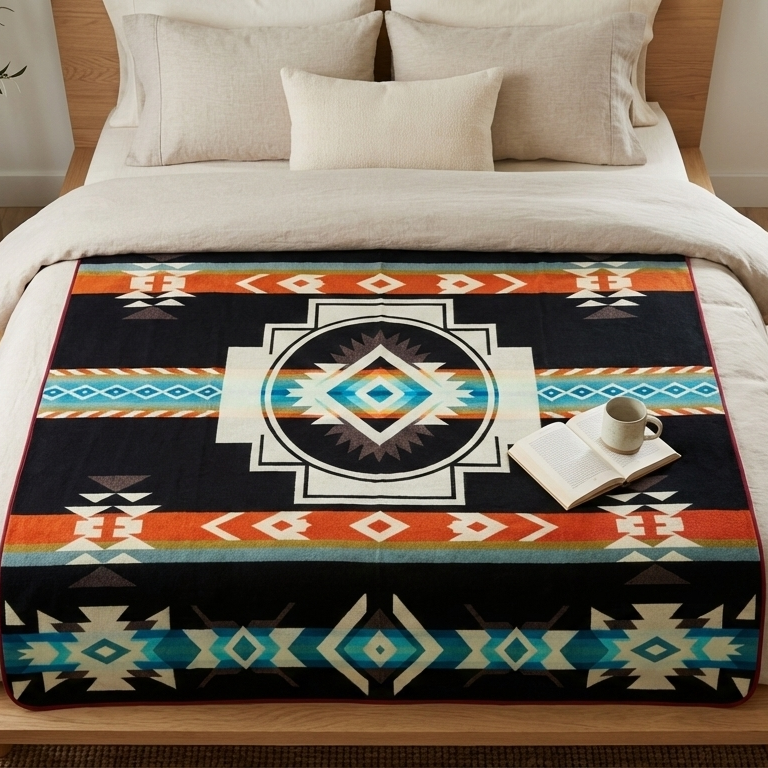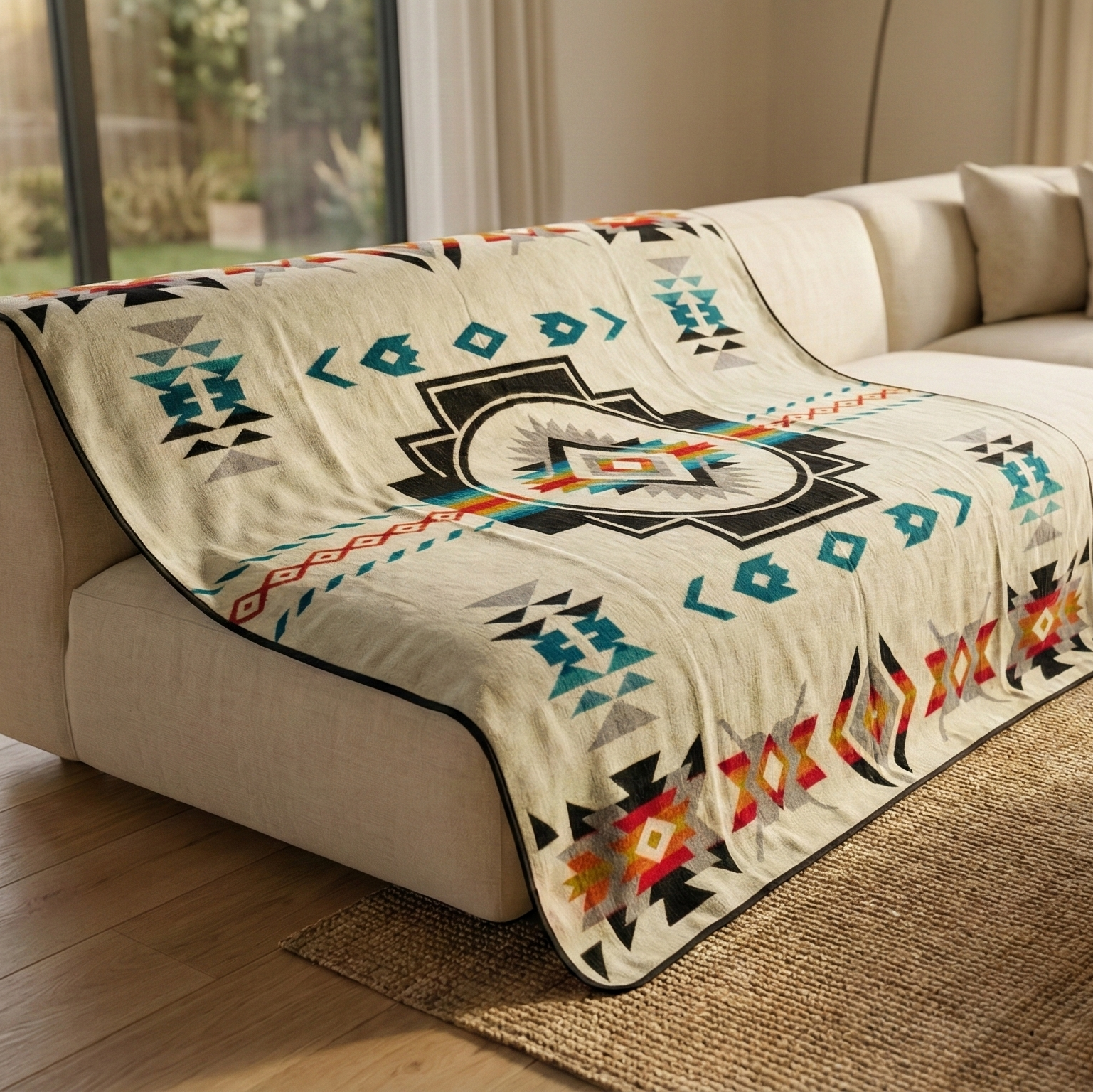 ring warmth, color, and timeless style into your space with the Sedona Horizon Southwestern Blanket. Featuring a bold turquoise base accented with rich red, ivory, and sun-washed gold geometric patterns, this blanket is inspired by classic Southwestern design and desert landscapes.
