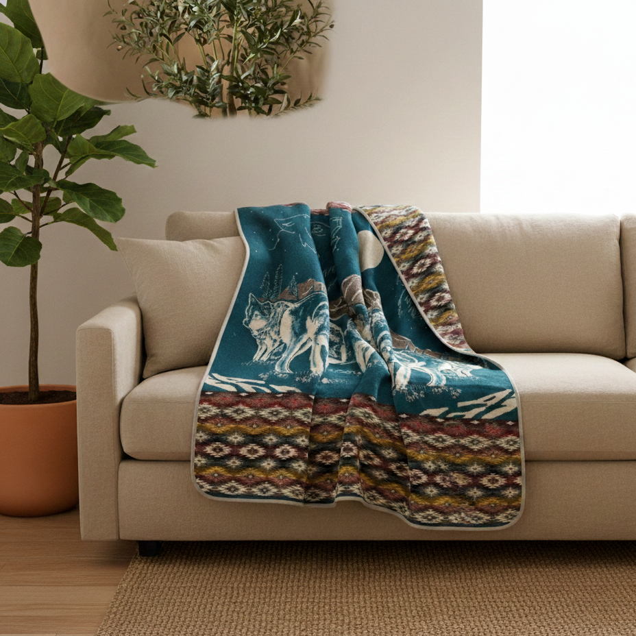 Bring warmth, color, and timeless style into your space with the Sedona Horizon Southwestern Blanket. Featuring a bold turquoise base accented with rich red, ivory, and sun-washed gold geometric patterns, this blanket is inspired by classic Southwestern design and desert landscapes.