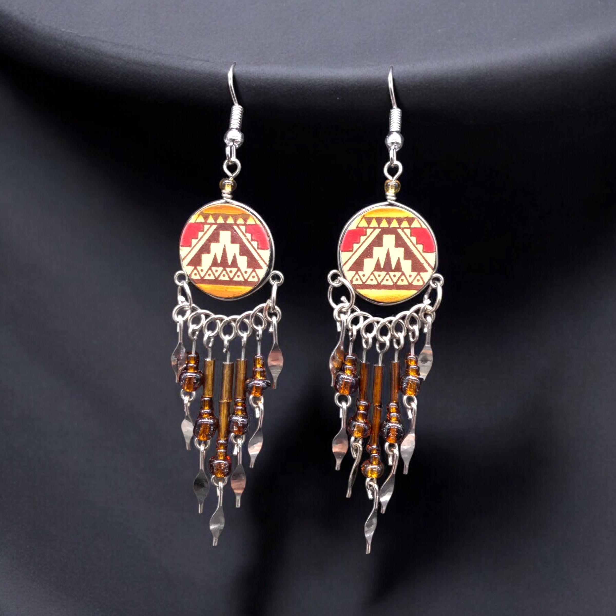 Round, bold design featuring intricate geometric patterns and earthy tones