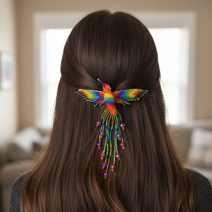 This stunning barrette showcases the artistry of Indigenous-inspired beadwork, featuring a radiant hummingbird design that symbolizes joy, energy, and renewal.