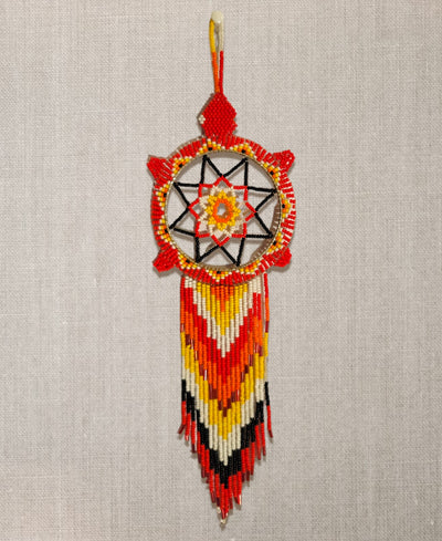 This Red Sun Star Dream Catcher is a beautiful statement piece for any home. Handmade with beads and vibrant colors, it's a unique and eye-catching way to bring native artwork into your living space. An ideal gift for loved ones, it's an inspiring reminder to keep chasing those dreams.