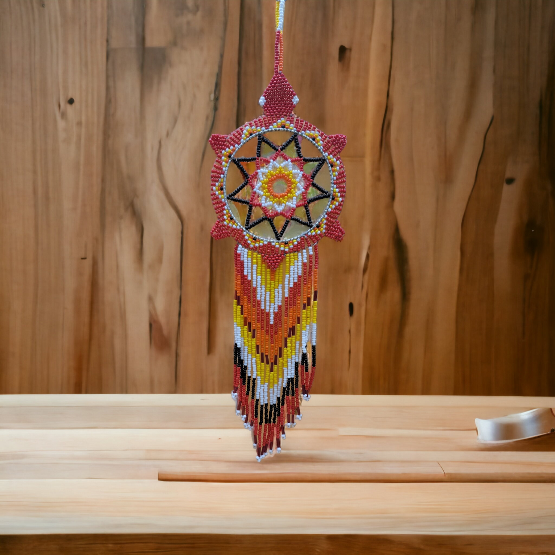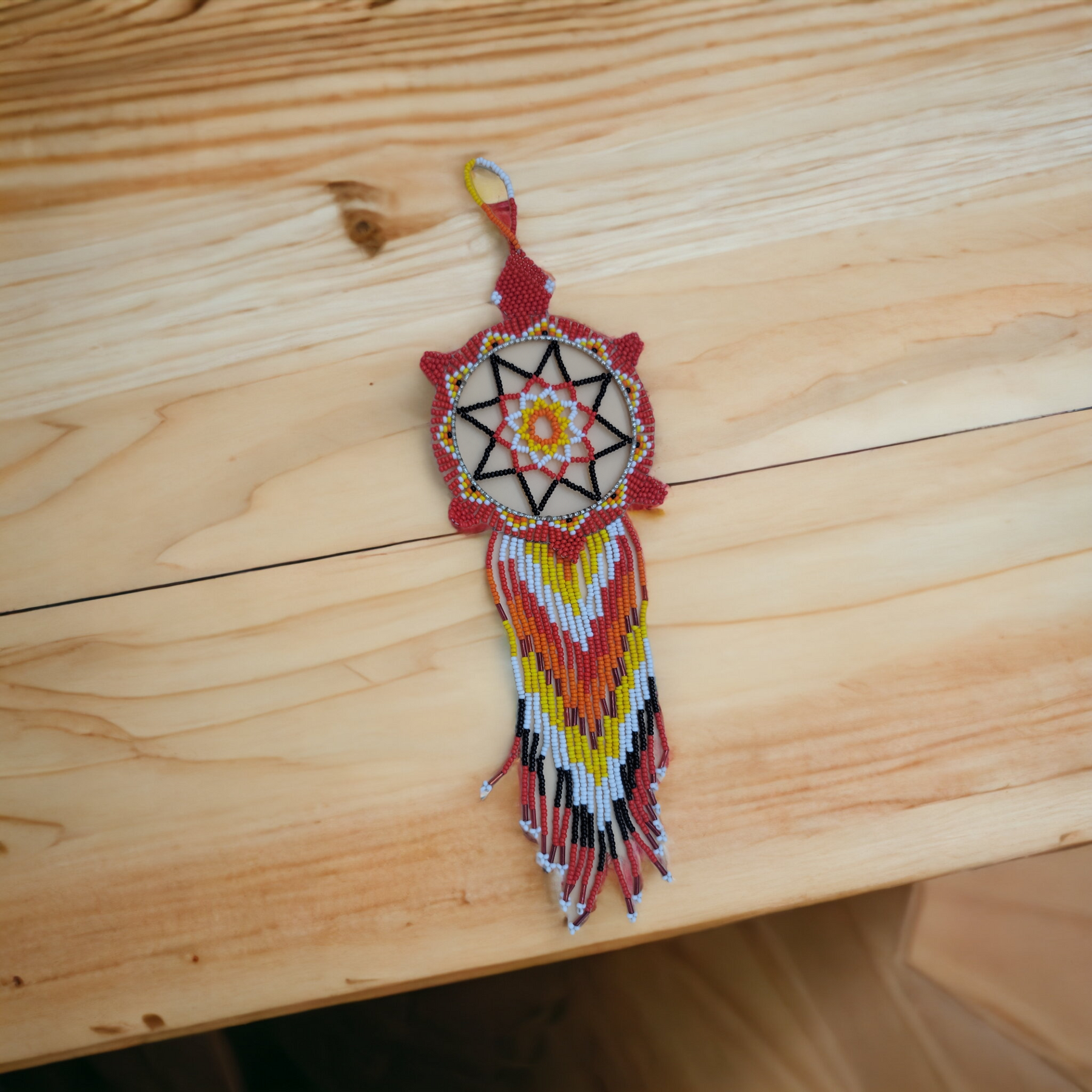 Add a touch of handmade beauty and positive energy to your space with this unique, all-beaded dreamcatcher. Carefully crafted using colorful seed beads and durable thread, this feather-free ornament is perfect for décor, car mirrors, small wall spaces, or as a thoughtful gift.
