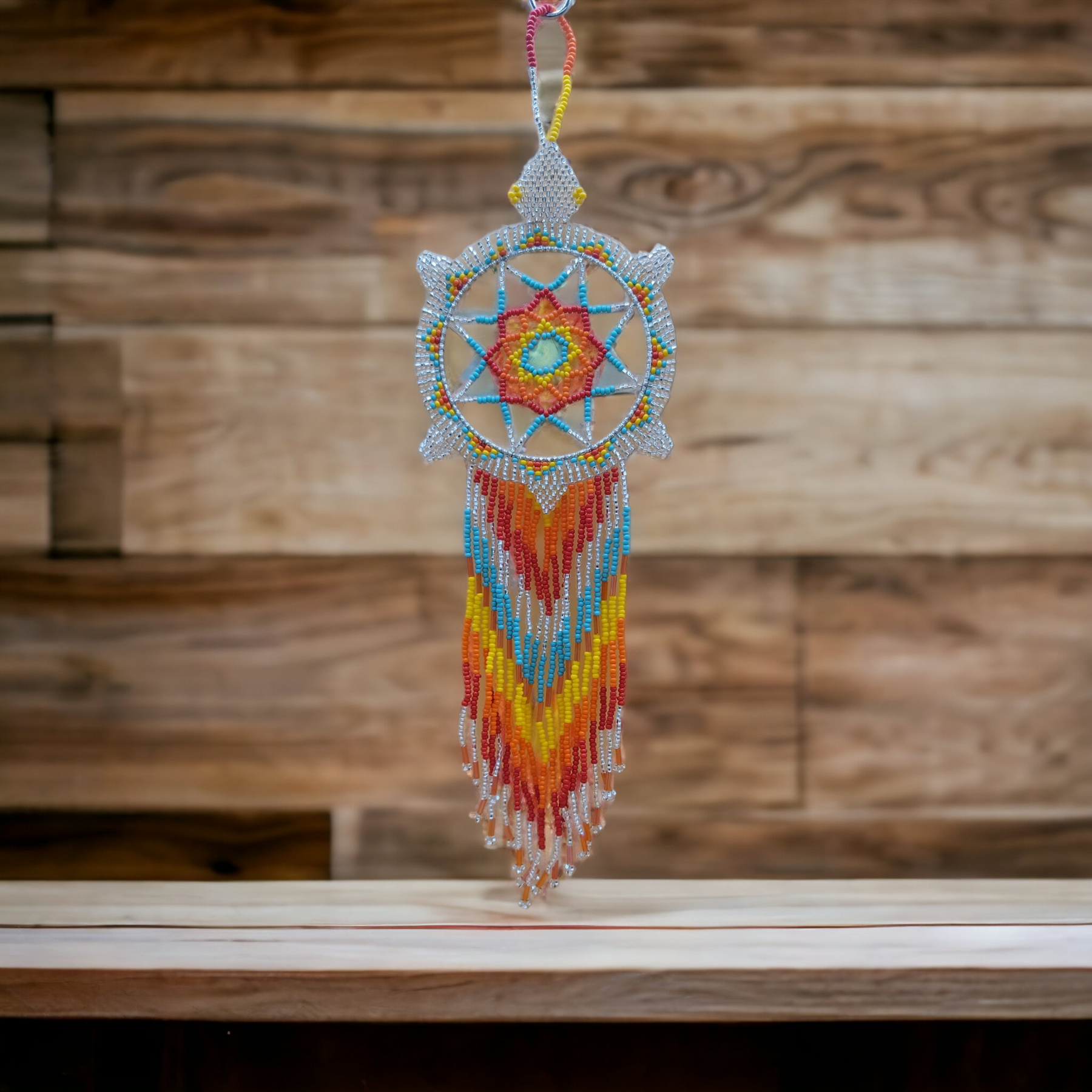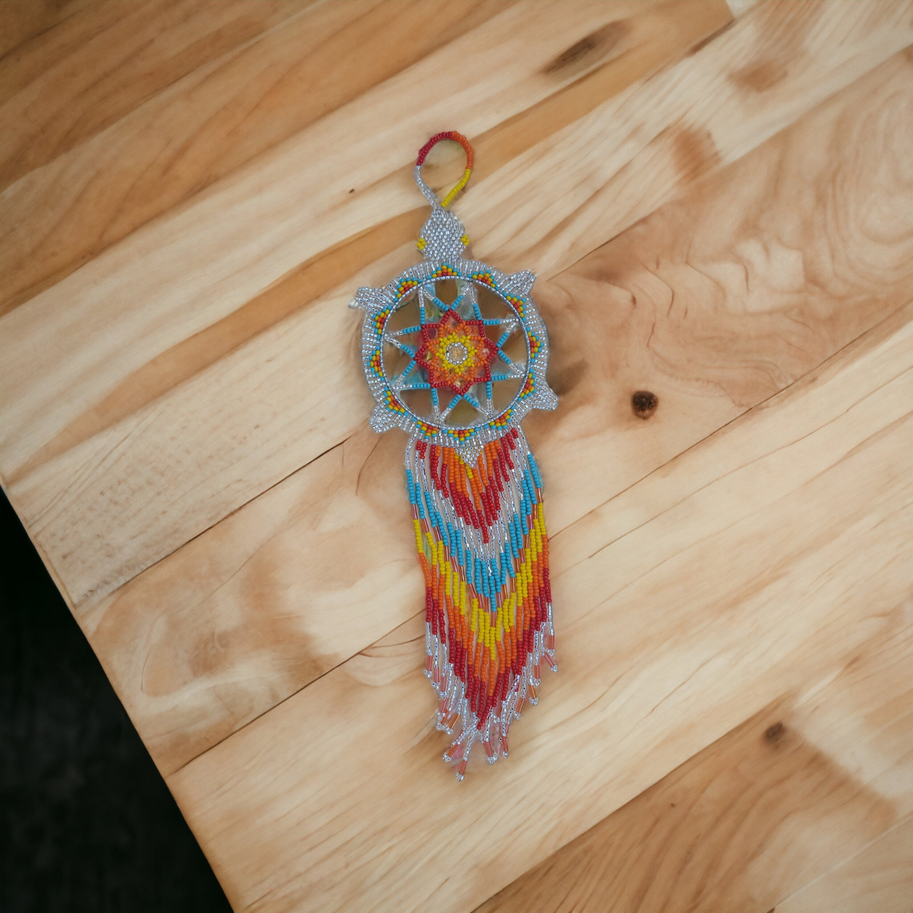 Add a touch of handmade beauty and positive energy to your space with this unique, all-beaded dreamcatcher. Carefully crafted using colorful seed beads and durable thread, this feather-free ornament is perfect for décor, car mirrors, small wall spaces, or as a thoughtful gift.