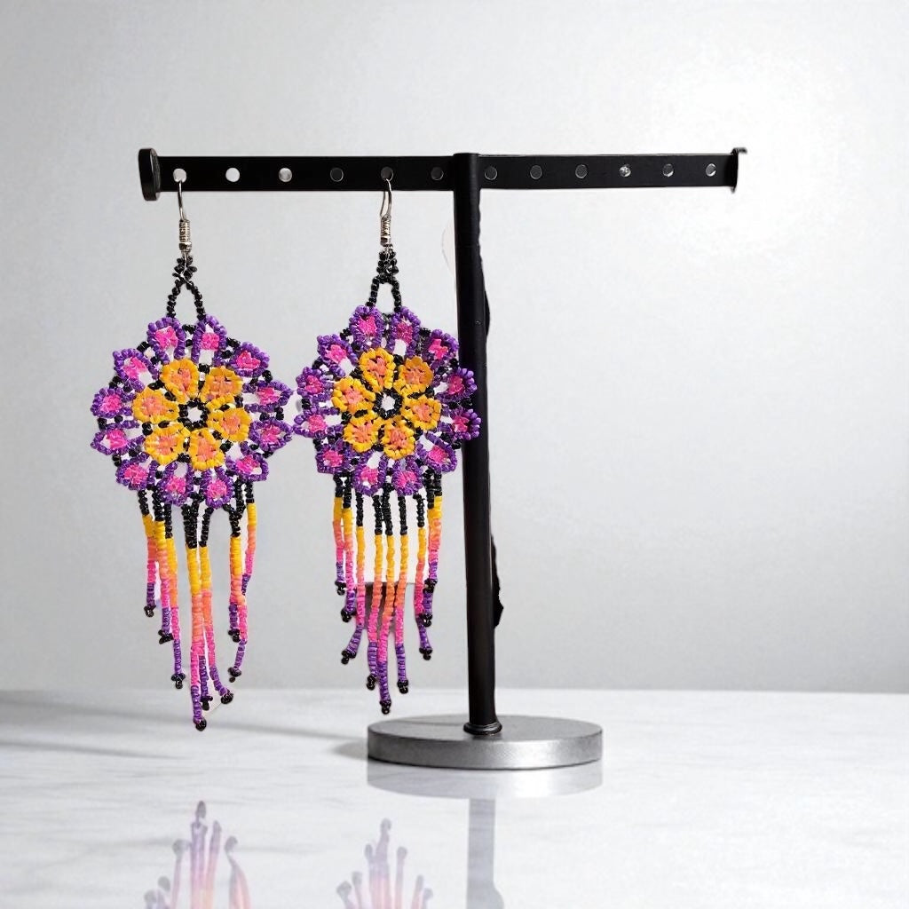 These earrings evoke the warmth and energy of a rising sun. The layered beaded petals form a radiant bloom that cascades into a striking fringe. Whether you’re dressing up a casual look or adding flair to your regalia, these earrings bring color, movement, and cultural pride to any outfit.