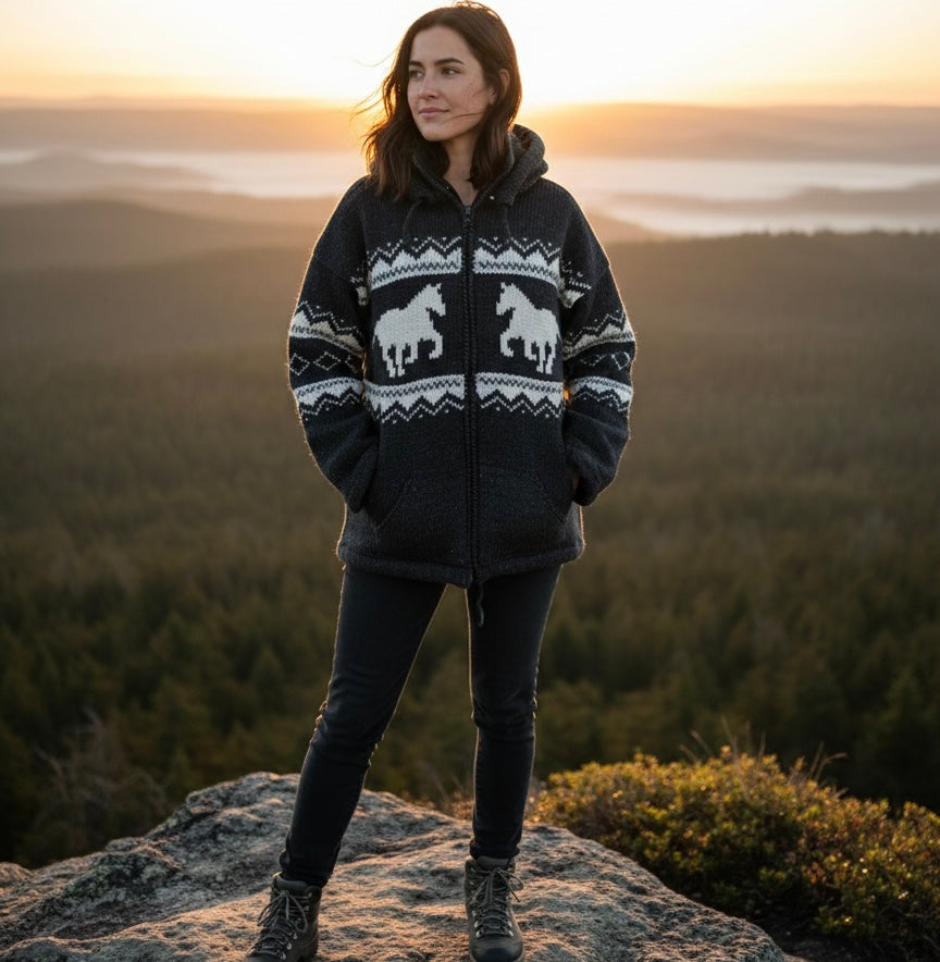 Our jackets come from Indigenous countries—Peru, Guatemala, Mexico, and Ecuador—and are 100% handmade. Our blankets are manufactured in Canada, and our beadwork is made by local artisans in Alberta.