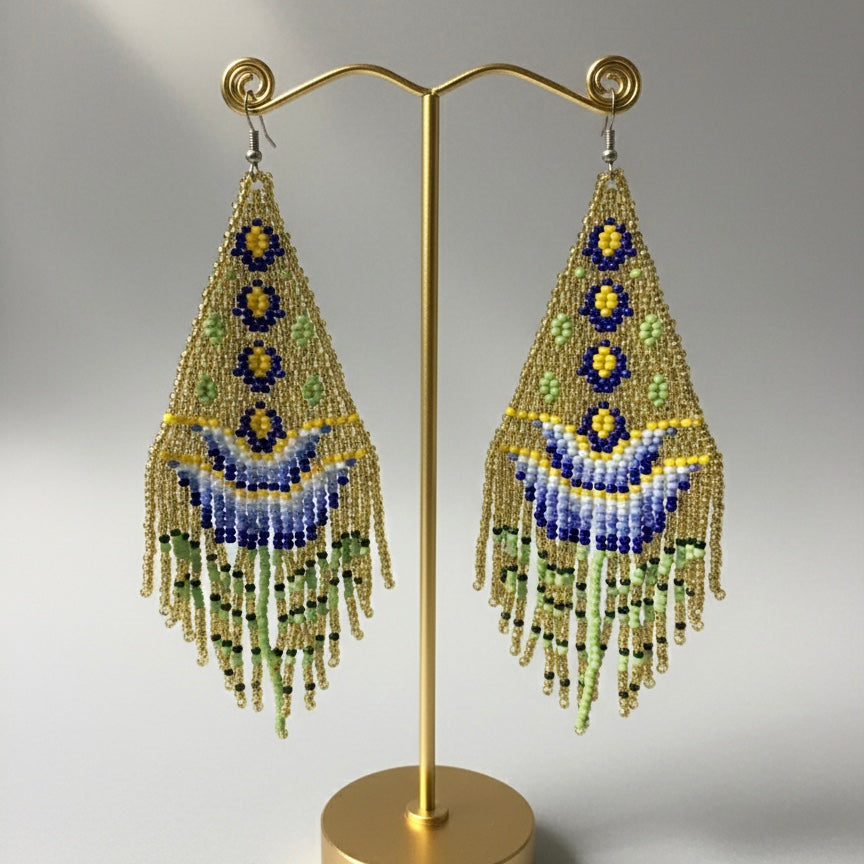 These earrings capture the essence of nature’s fire and flower — bold, radiant, and full of life. The intricate pattern symbolizes blossoming strength and vibrant spirit, while the carefully hand-woven fringe adds soft rhythm and fluidity. Perfect for powwows, festivals, or to elevate your everyday style.