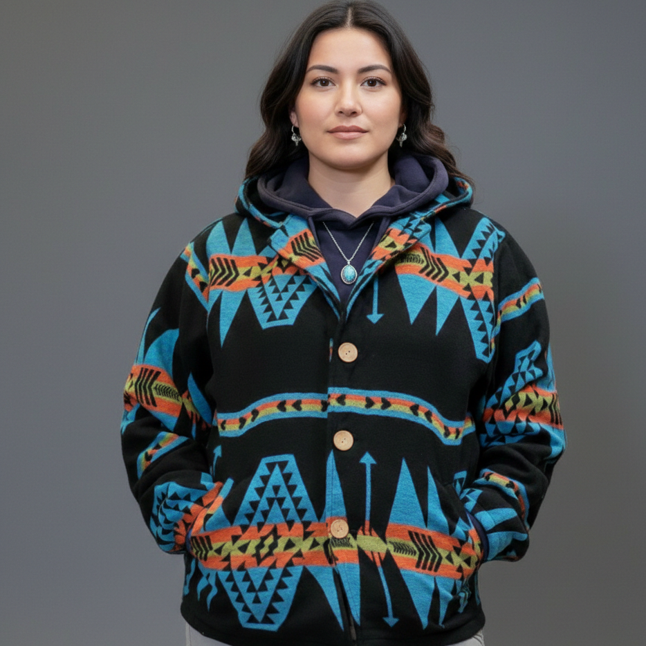 Our jackets come from Indigenous countries—Peru, Guatemala, Mexico, and Ecuador—and are 100% handmade. Our blankets are manufactured in Canada, and our beadwork is made by local artisans in Alberta.