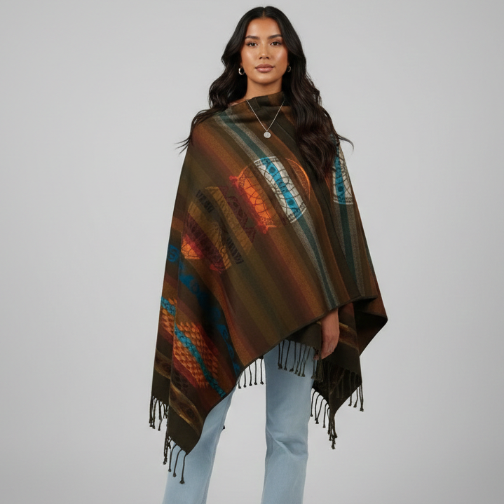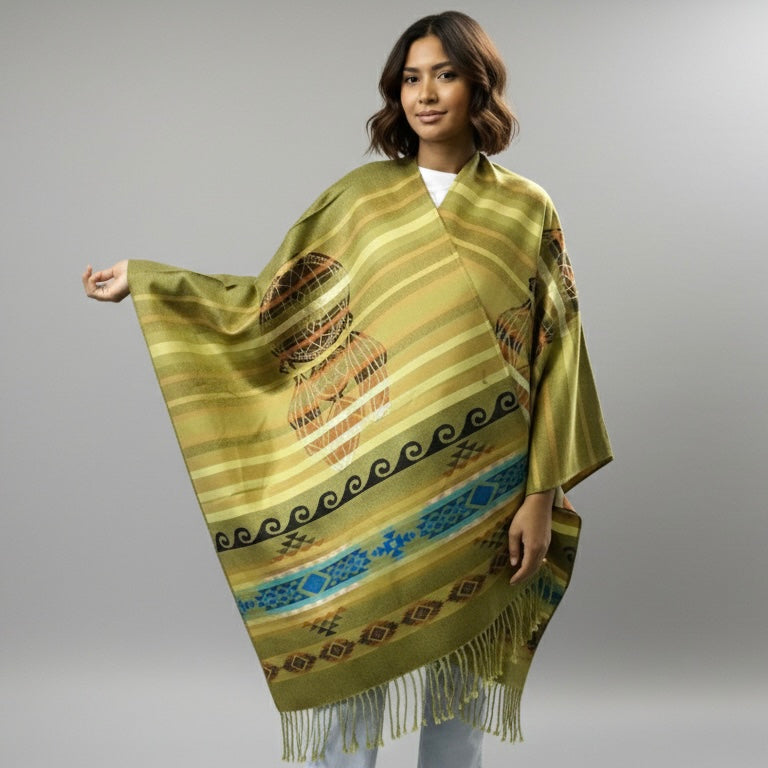 Reversible open poncho woven by hand by Native artisans . Native contemporary style . This collection allows a versatile use, it can be worn as a jacket, a shawl or a pashmina. In addition, this model is reversible,