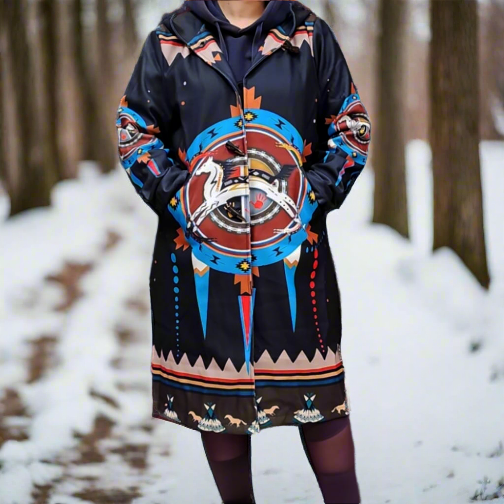 Our jackets come from Indigenous countries—Peru, Guatemala, Mexico, and Ecuador—and are 100% handmade. Our blankets are manufactured in Canada, and our beadwork is made by local artisans in Alberta.
