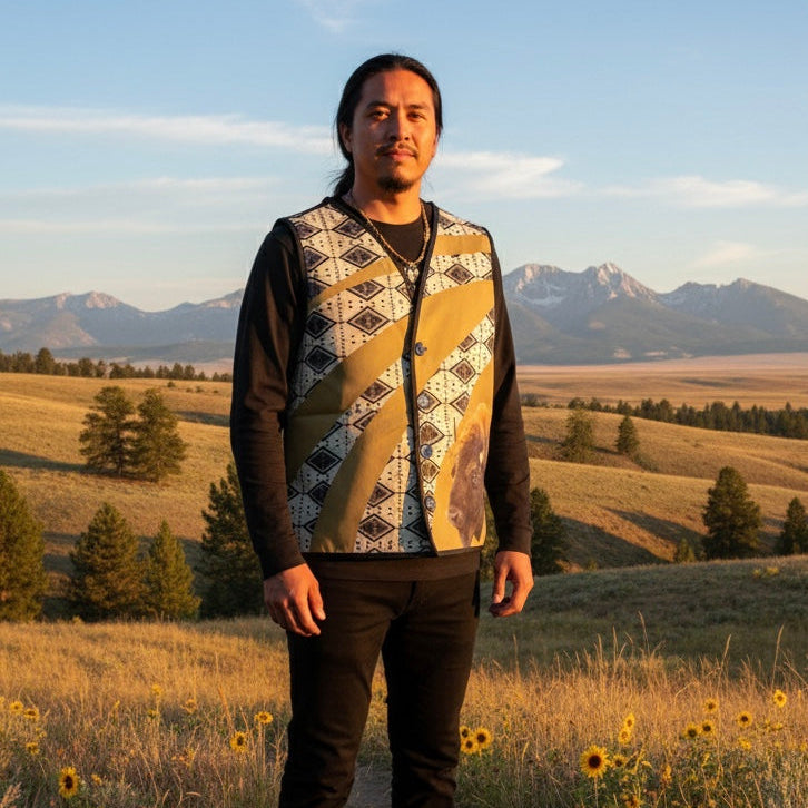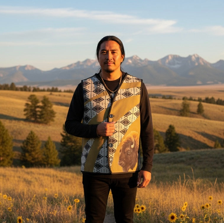 This vest features a powerful design blended with traditional geometric patterns inspired by the lands and cultures of the Great Plains. Made to stand out with pride, it’s lightweight, comfortable, and perfect for ceremonies, gatherings, powwows, socials, or everyday wear.