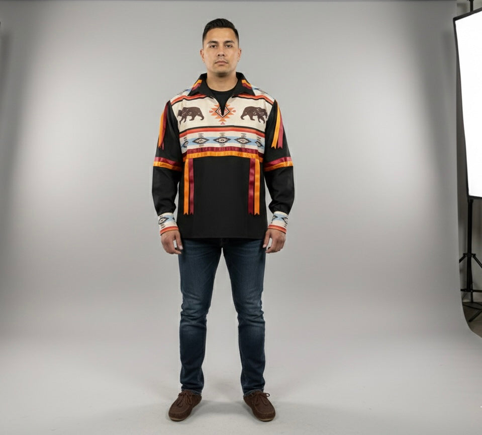 Our jackets come from Indigenous countries—Peru, Guatemala, Mexico, and Ecuador—and are 100% handmade. Our blankets are manufactured in Canada, and our beadwork is made by local artisans in Alberta.