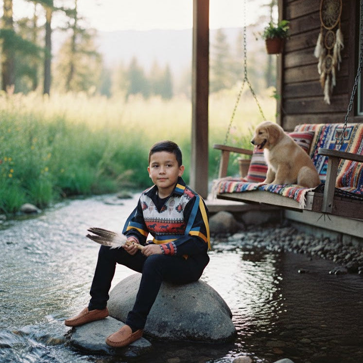 Our jackets come from Indigenous countries—Peru, Guatemala, Mexico, and Ecuador—and are 100% handmade. Our blankets are manufactured in Canada, and our beadwork is made by local artisans in Alberta.