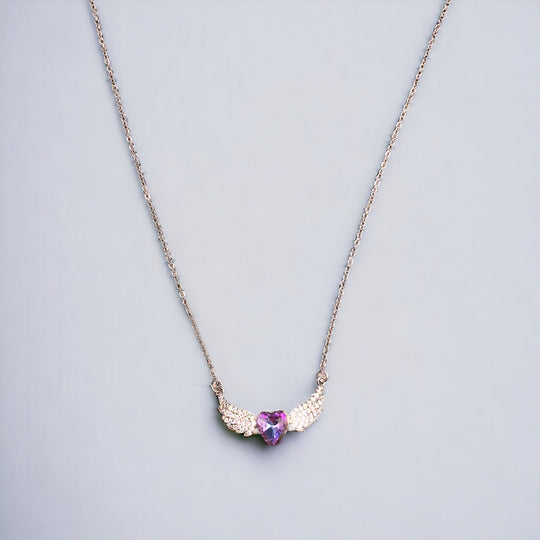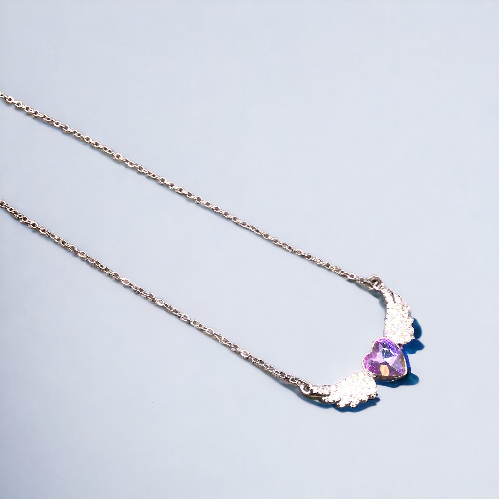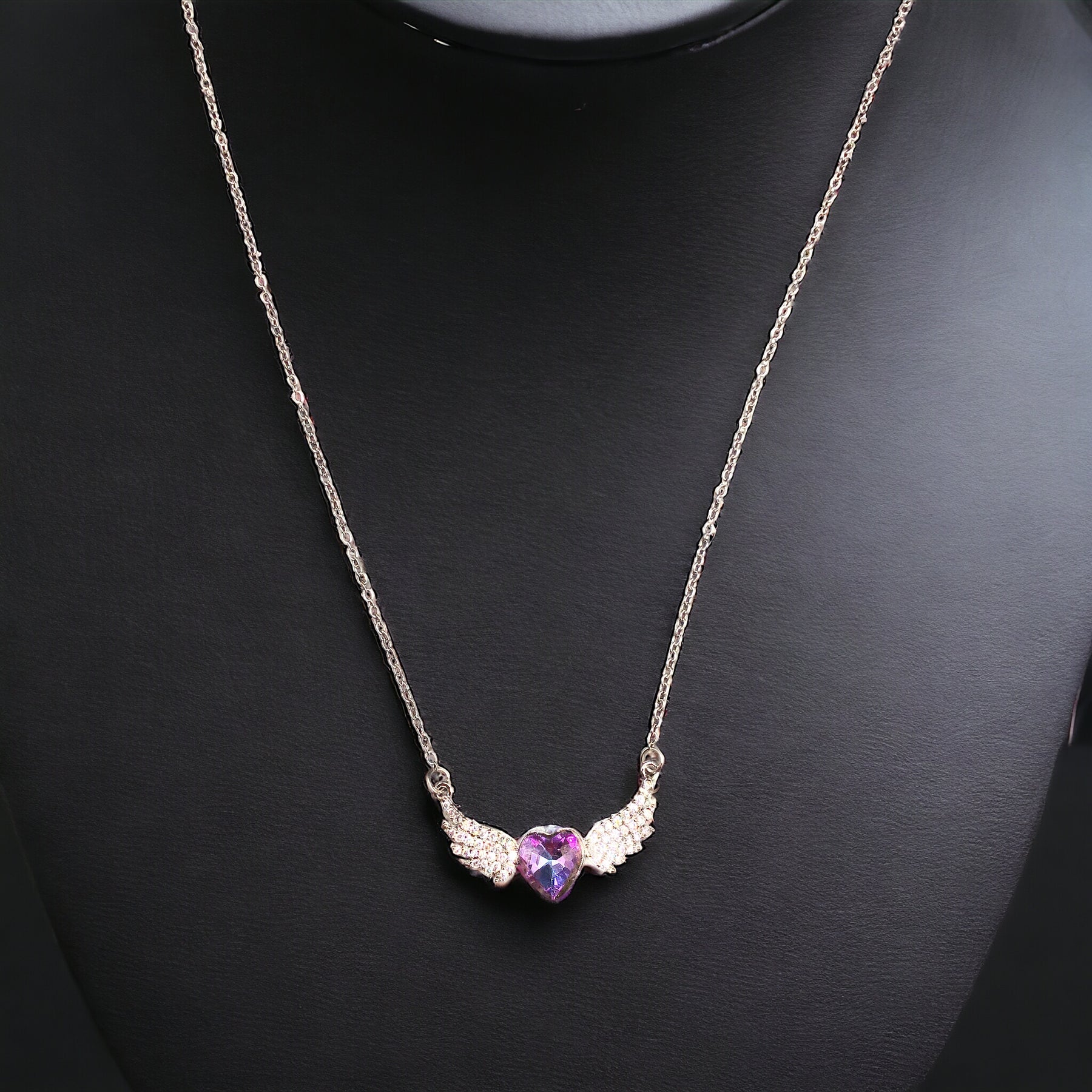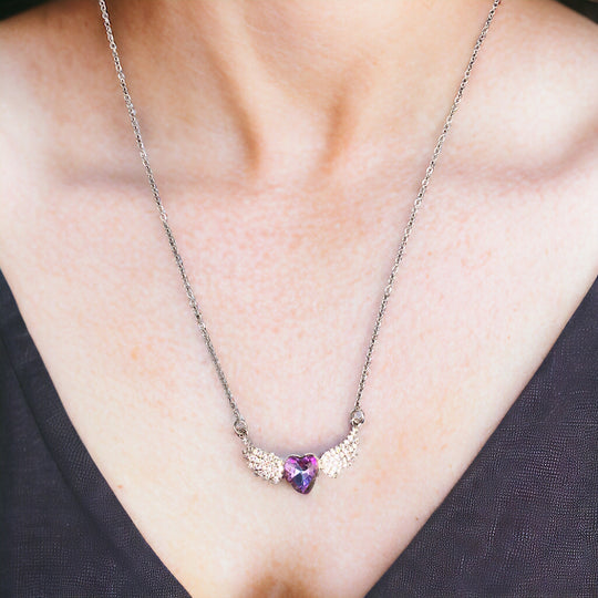 Purple heart with feathers Stainless Steel Necklace Pendants With Long Chain