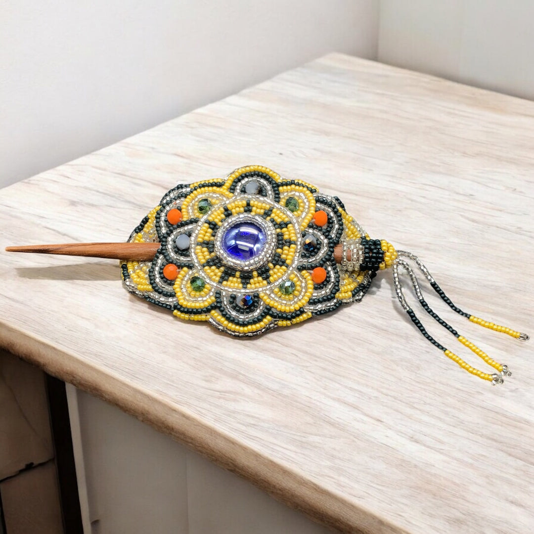 Native American Style  Barrette  measuring 12 cm wide 11/0 Seed Beaded Barrette., Natural Sheesham Wood Hair Stick..