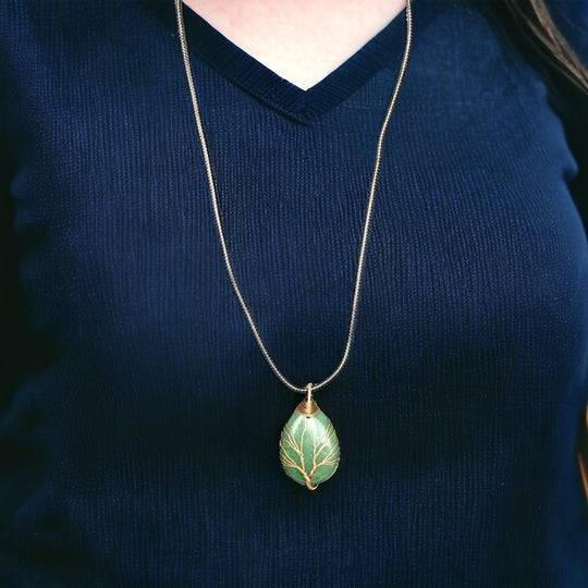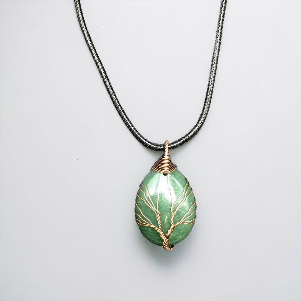 Green Gemstone Pendant Wrapped w/ Copper Tree of Life
